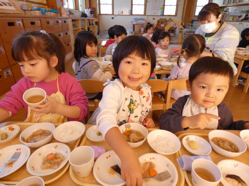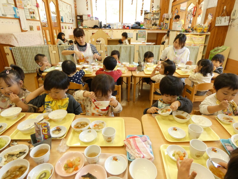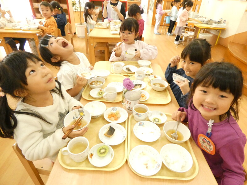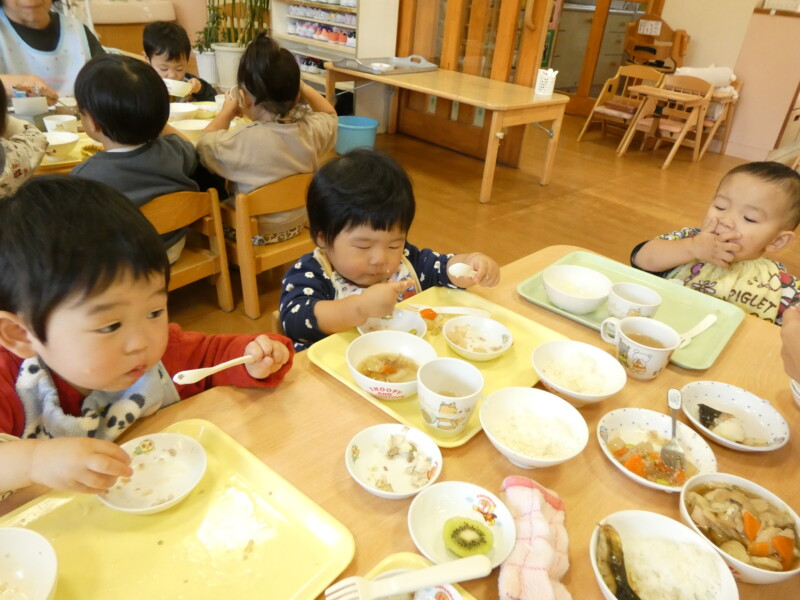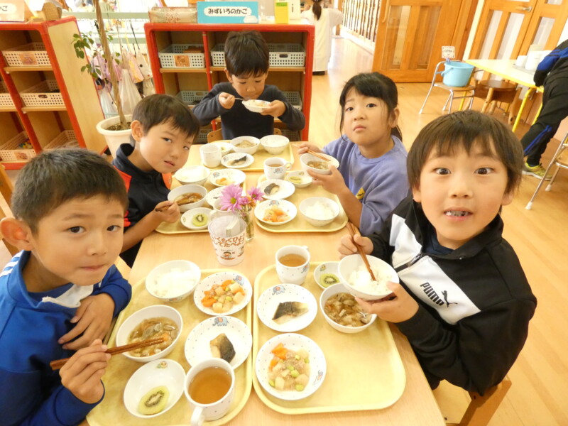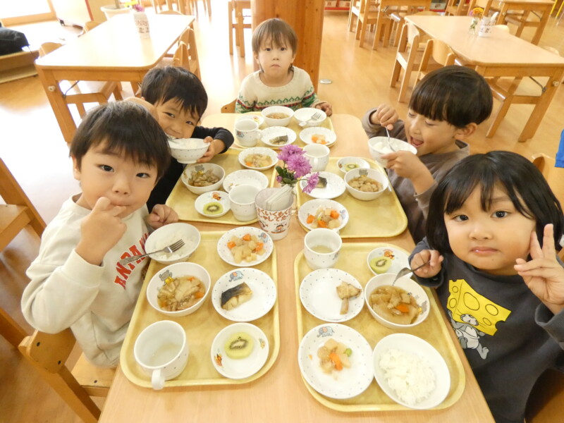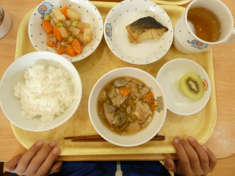 さて、本日の献立は「ホッケの塩焼き」「大根のそばろ煮」そして八戸名物「せんべい汁」でした。大根と人参を小口に切り、豚の挽肉と合わせ、とろみをつけた大根のそぼろ煮は、冬の野菜のうまみをたっぷり出していました。八戸名物「せんべい汁」は、人参、牛蒡やシイタケなどの野菜がたっぷり入り、鶏肉の出汁でおいしい一品でした。我が園では、なべ物用の「おつゆせんべい」ではなく、普通の白せんべいを使っているのでくちどけも早く、軽塩梅なのでご飯との相性は抜群です。しかもご飯は新米ですから文句のつけようがありません。新米になってからご飯のおかわりが多いように感じるのは私だけではないようです。食欲の秋、もう少し楽しみたいと思います。昨日は、薩摩芋の収穫をしましたが、子どもたちに聞くと、「今日料理してくれる」そうです。焼きいもで食べた子もいたようですが、明日、どんな料理で食べたか聞いてみようと思います。