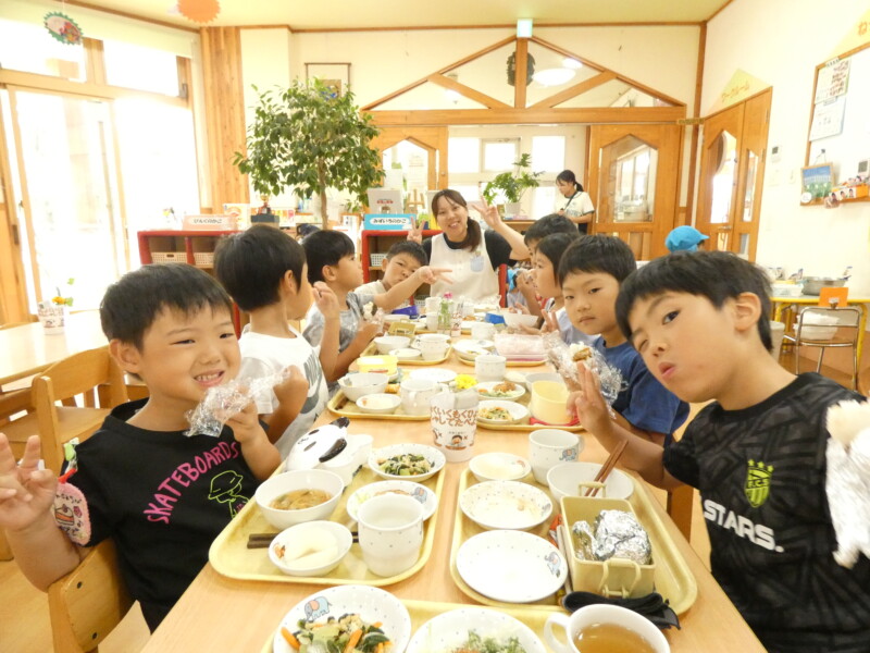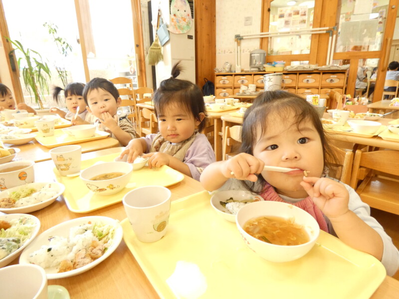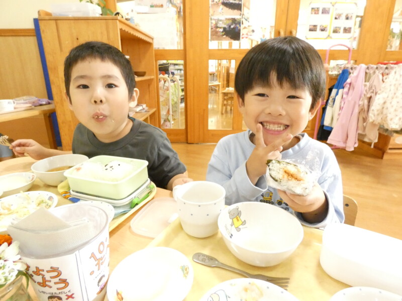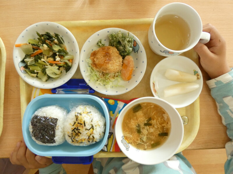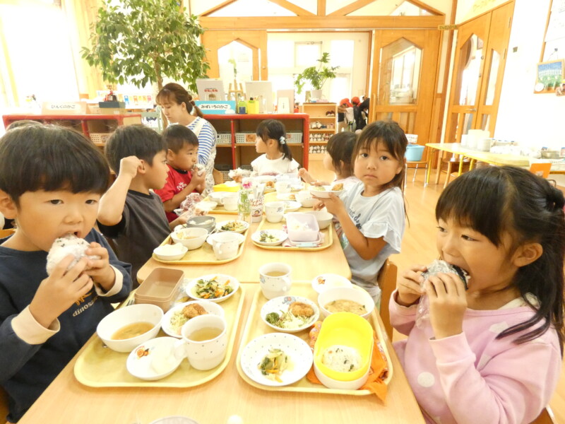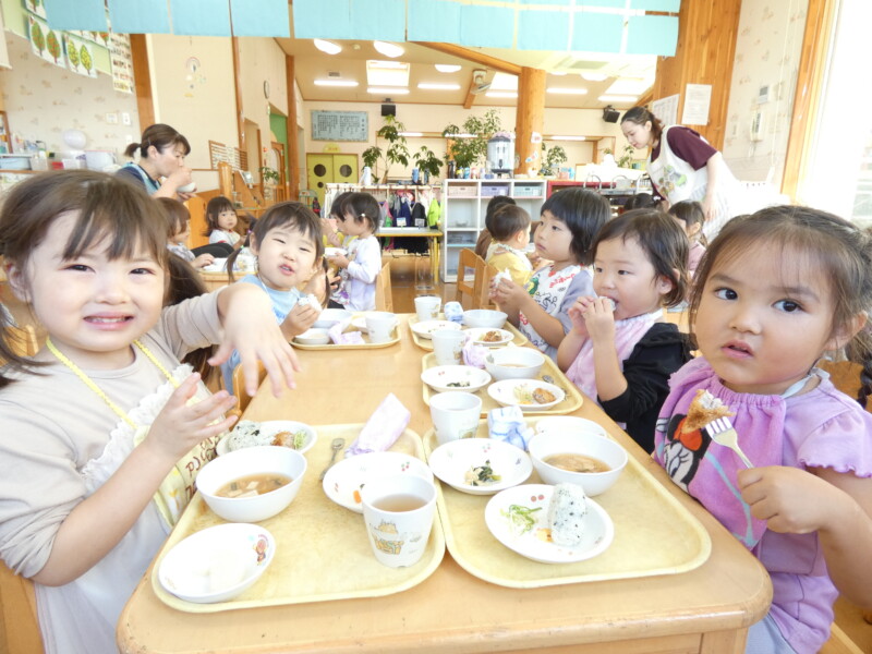 10月8日(水) 今日は年長組のお友だちが、根城小学校音楽会の予行練習を見学させていただきました。長坂保育園出身のお友だちを見つけると手を振ったり、一緒に歌ったりして楽しんできたようです。子どもたちはもちろん、引率で行った職員の方が卒園児に会えるのを心待ちにしていたので、立派な演奏や成長した姿を見ることができ、喜んで帰ってきていました。今週土曜日の本番も、ぜひ頑張って下さい! さて今日の給食は、千切りキャベツがそえられたサクサクの食感の『豚カツ』でした。畑で採れた人参やピーマン、人参の葉の天ぷらを食べたいお友だちは盛り付けてもらい、一緒に食べていました。スーパーでは見る事の無い人参の葉だったので、はじめて食べたお友だちは「人参の葉っぱ、おいし~い!」とパクパク食べていました。「おばあちゃんの家のお米だよ!」とおにぎりを見せてくれた男の子は、稲刈りも体験してきたようで、新米のおにぎりを美味しそうに食べていました。「お父さんが作ってくれた」「今日は2個だよ」と子どもたちは手作りのおにぎりを喜んでいました。(若江)