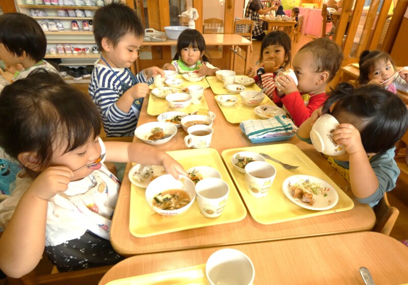 10月2日(木) 朝、雨上がりの園庭は金木犀の甘い香りが漂っていました。10mくらい離れたところでも十分その甘い香りを認識することができました。今日は、近くのこども園とサッカーの練習試合をしたようです。ニコニコと笑顔で帰ってきたのは勝ったということでしょうか。報告してくれたキャプテンと副キャプテンの鼻の穴が少し膨らんでいるようでした。大会まであと20日。いよいよ練習に熱が入ってきたようです。土曜日は史跡根城祭り。朝のよさこいの練習も盛り上がっています。スポーツの秋、イベントの秋、そして明日は食育祭り。しっかり秋を楽しんでいるようです。 さて、本日の献立は「エビと絹厚揚げの中華煮」と「棒棒鶏」でした。3歳児の「たくさんエビ食べた」という子と「エビだけ残した」という子がいて、アレルギー対応、好き嫌い対応の難しさを改めて感じた園長でした。棒棒鶏にはたくさん野菜が入っていて、一見「サラダ」のようでしたが、みんなもりもり食べていました。食欲の秋、とはよく言ったものです。まぁ、秋でなくてもよく食べる子どもたちです・・・。