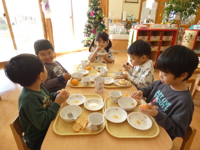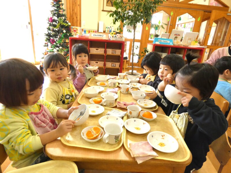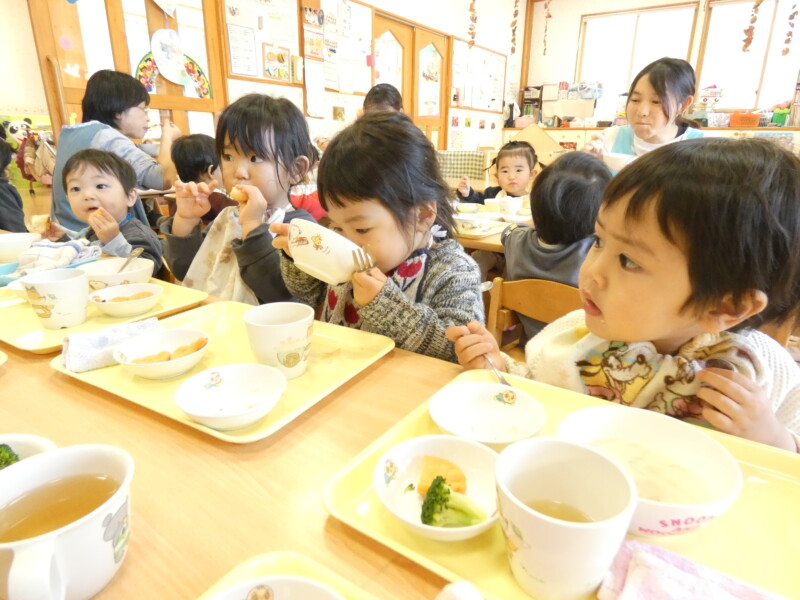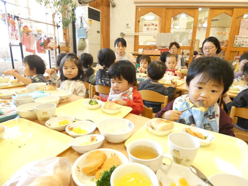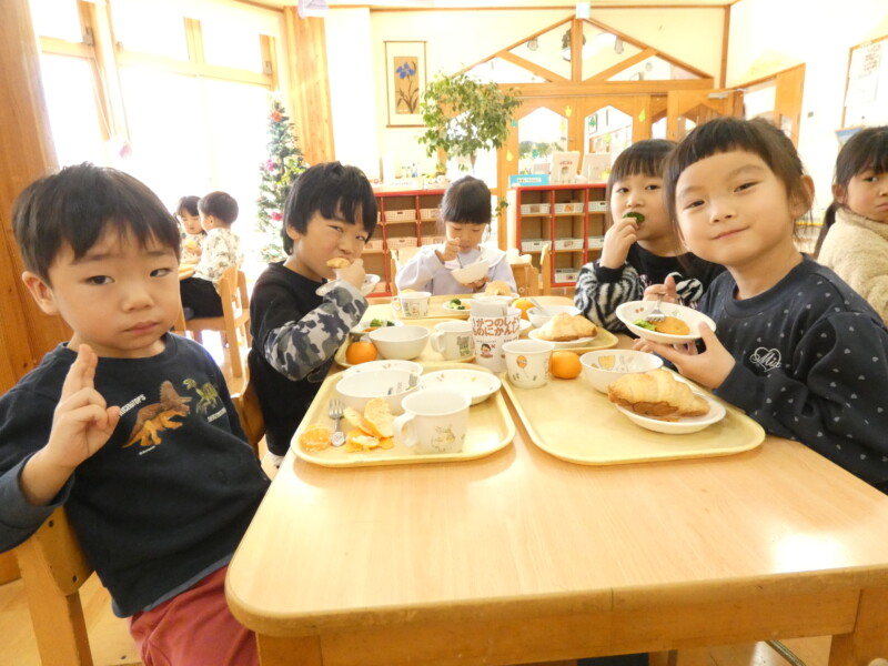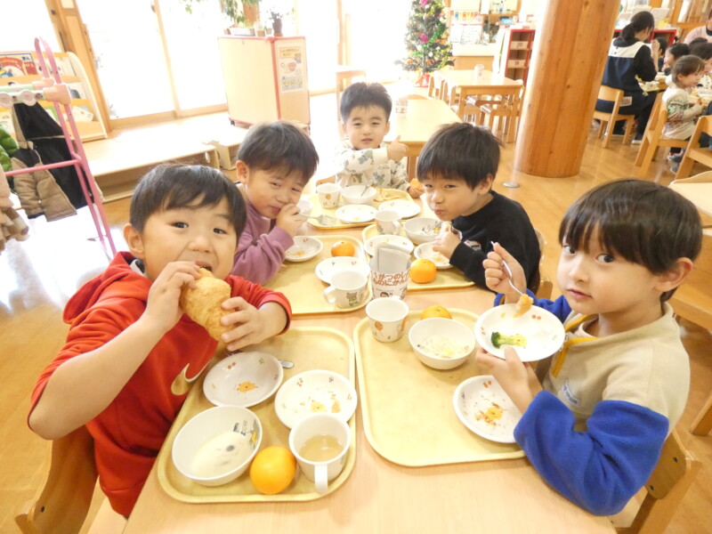 11月29日(土) 今日は朝から風が強く、思わず「寒い…」と言葉がもれてしまいました。園庭の”かりん”はこの風の強さで、全部落ちてしまったようです。寒さもへっちゃらな子どもたちは、元気に「おそといってきまーす」園庭や散歩に出掛けていました。風で集められた落ち葉の山から、きれいな葉を見つけたり、踏んで感触を楽しんだりしたようです。さて、今日の給食はこの時期にピッタリの『クラムチャウダー』でした。鶏肉やアサリ、じゃが芋や人参、玉ねぎコーン、しめじなどの具が沢山入り、おかわりをして食べているお友だちが多かったです。パン工房アヴィニオンさんの『クロワッサン』は子どもたちにとても人気があり、登園した時から「クロワッサン♪」と楽しみにしているお友だちもいました。写真を撮りに行くと、すでにお皿はきれいになった状態で「たべちゃった」と満面の笑みで教えてくれました。来週はいよいよ3・4・5歳児クラスの発表会が行われます。地域でも様々な感染症が流行しているようなので、栄養のあるものを食べ、よく眠り、しっかりと手洗いを行いながら、予防していきましょう。(若江)