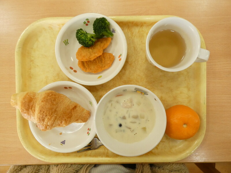 クロワッサン クラムチャウダー ナゲット ブロッコリー みかん お茶