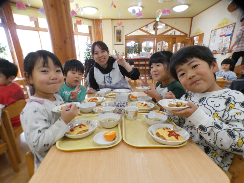 12月13日(土)今日は、ほとんどのクラスが室内で運動あそびをしたり、好きなコーナーで遊んだりしました。 つくし組のお友だちが2階のたんぽぽ組の部屋で遊んだのですが、いつもと違う環境や玩具に興味津々で、集中して遊んでいました。早いもので、年明けには各クラス来年度に向けて少しずつ「移行」の準備が始まります。無理なく子どもたちに合わせて進めていきたいと思います。 年長組の園児がニュースを見たようで、「学校の給食が食べれないんだって。保育園では食べれるよね」と言っていました。毎日お弁当の小学校もあるようです…。長坂は無事で、被害も少なくてよかったなと改めて思いました。今日の給食はみんな大好きなオムライス!バイキングでは「おおきいのください」と言う子が多く、「ハートかいて! 星かいて!」とケチャップのリクエストも多かったです。ジャーマンポテトはおかわりする子が多かったですよ! (佐々木綾乃)