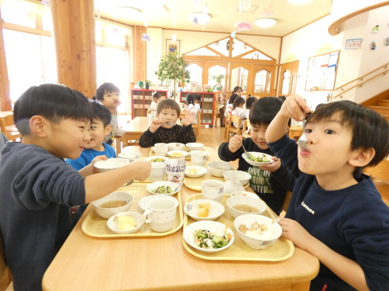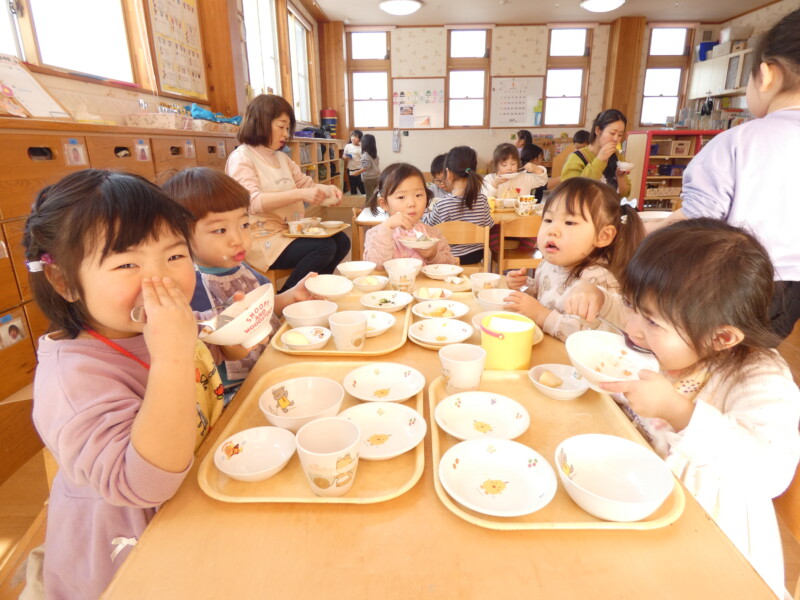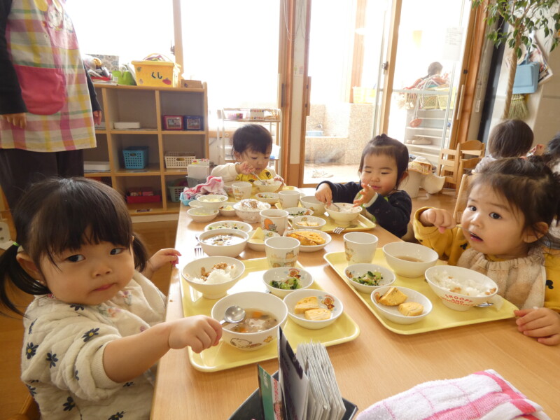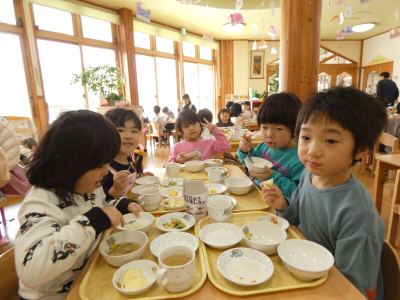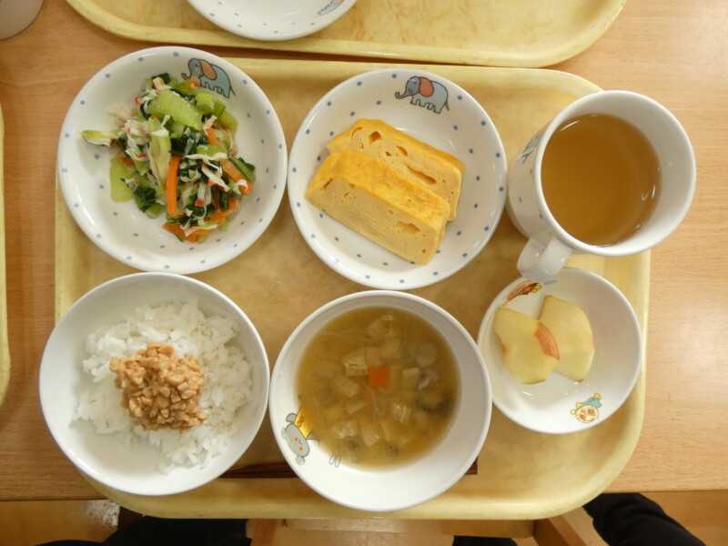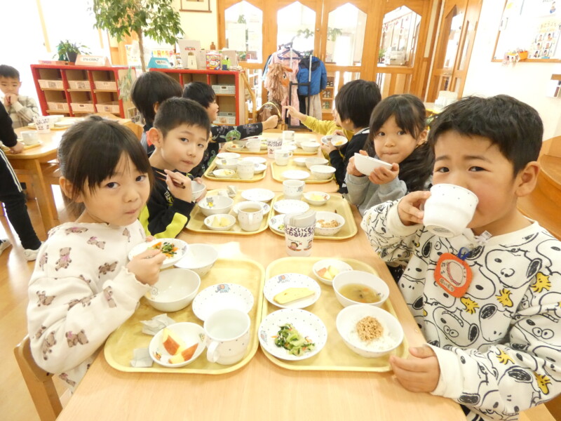 1月9日(金) 昨日の午後、一気に降った雪のおかげで、今日は1歳児クラスから園庭で雪遊びを楽しんでいました。年長組のお友だちはどのくらい積もったのか気になったようで「定規貸してください!」と来ていました。3センチだったようですが、ふわふわの雪にみんな大喜びで遊んでいました。さて、今日の給食は『厚焼き玉子』『青梗菜とカニカマのお浸し』でした。甘みのある卵焼きと、さっぱりとしたお浸しの相性も良く、グルメな男の子はお浸しを食べながら「カニカマと合うなぁ」とつぶやきながら食べていました。ご飯にはひきわり納豆がのっていたので、3歳児のお友だちは「ねっばねば~」とケタケタ笑い合いながら楽しそうに食べていました。青森県の郷土料理、第2弾として今日は『けの汁』が登場しました。味噌汁の中に、細かく切った大根・人参・ごぼう・椎茸・わらび・こんにゃく・油揚げが入り、栄養満点でした。津軽地方で食べられることが多いので、八戸では食べる家庭が少ないかもしれませんが、子どもたちには人気でおかわりをして食べるお友だちが多くいました。(若江)