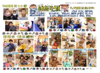 嘔吐、下痢、腹痛の子が増えています。 ひよこ1名、つくし1名、すみれ1名が罹患しています。うがい手洗いの徹底と不安な時は早めの受診をお願いします。 2月10日