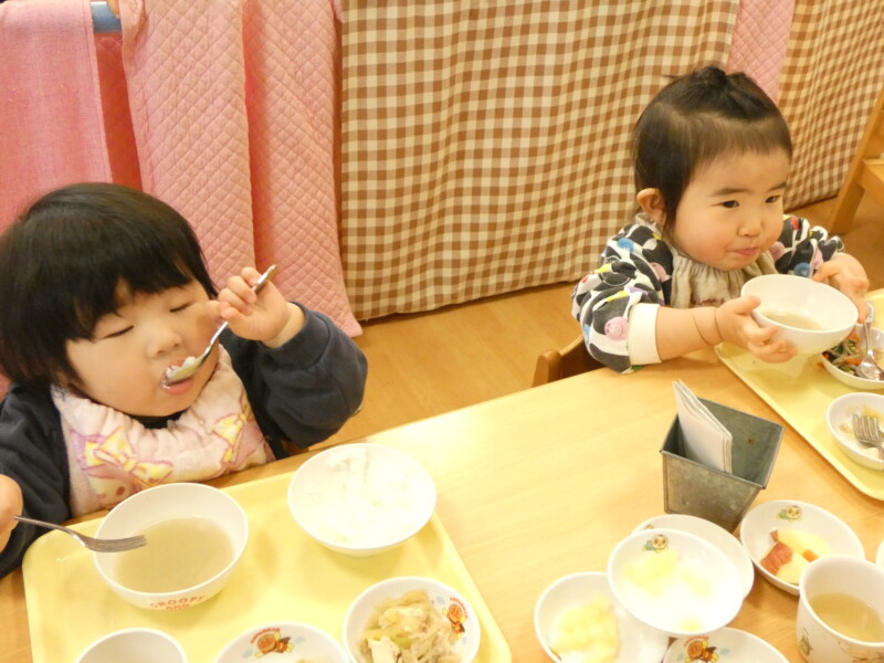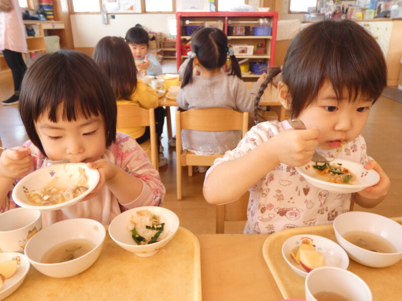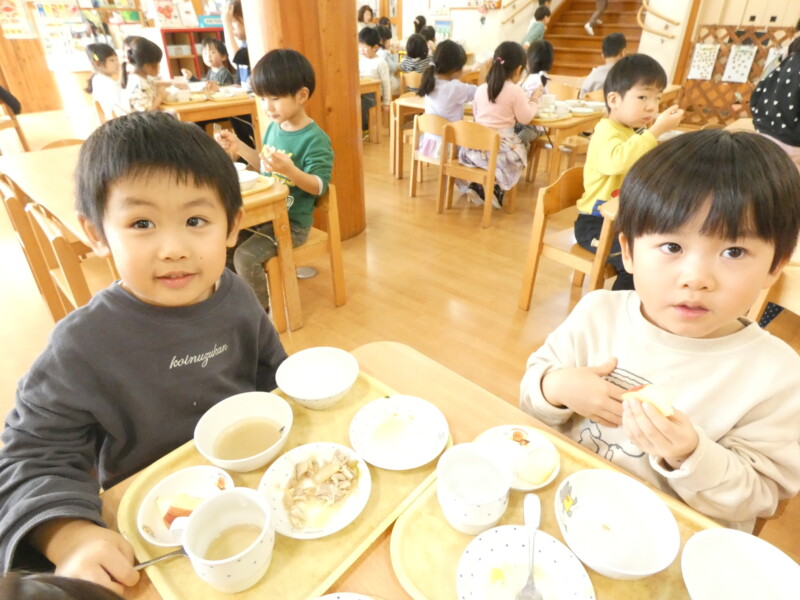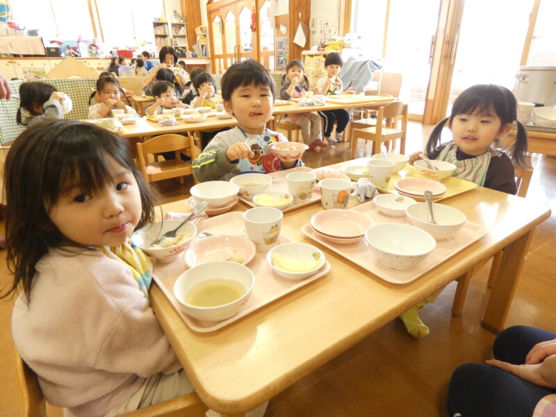 1月27日(火) 「野菜委員会からのお知らせです。今日のうどんには南瓜が入っています。カロテンがたくさん含まれているのでお肌がすべすべになります。」それを聞いていた年長組の女の子、「園長先生のお肌もすべすべになるのかなぁ?」・・・残念ながらなりません。もう手遅れです。今まで何個の南瓜を食べたことか・・。でも、私にもお肌プリンプリン、すべすべの時もあったのです・・・ずいぶん昔に。冬になって寒波に見舞われているので野菜委員会もお休みだと思っていたら、しっかりお仕事をしていました。 さて、本日の献立は「ほうとううどん」と「ミートボール」でした。ほうとううどんは、信州地方の名物です。学生時代にオートバイで長野県に行ったとき、ドライブインで何回か食べましたが、味についてはあまり良く覚えていません。うどんより「蕎麦」がおいしかったことを覚えています。特に「戸隠そば」はおいしかったなあ。ということで「ほうとううどん」の話、我が園のほうとううどんには、シメジ、油揚げ、人参、小松菜、大根、ネギそして南瓜が入っています。出汁は豚肉で味噌味になっています。たくさんの野菜が入り、今の時期には最適なメニューでした。うどんは中細麺を使っているのでラーメン感覚で食べられました。今月いっぱいは寒い日が続くようです。あったかい食べ物を食べてしっかり睡眠をとり、寒さ対策をしたいと思います。