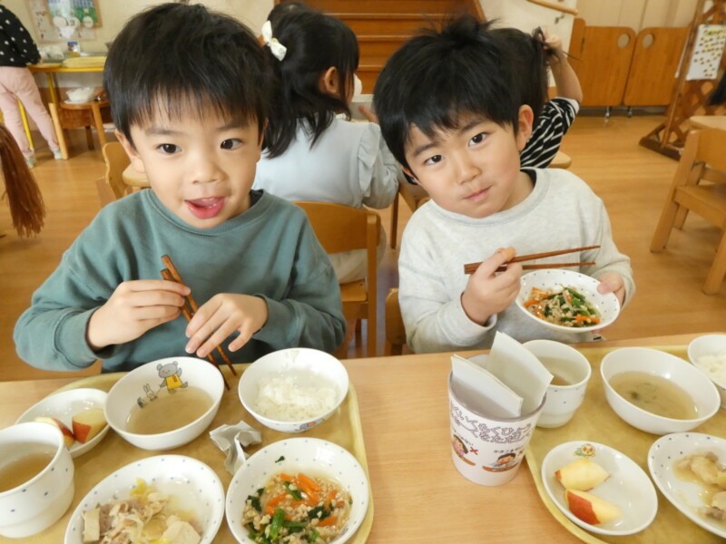 2月2日(月) 最近あいさつ運動がブームなお友だちたちが、当番以外の日にも玄関に来て、元気に挨拶をしています。人数も増えてきたので、交代で行う日もありますが、元気いっぱいな「おはようございます」の声が響いています。そんな子どもたちが今朝は「明日、オニくるよね?」と話していました。「こわい~」と言うお友だちもいれば「戦う!」と話しているお友だちもいて、明日の節分を楽しみにしている様子でした。 さて、今日の給食はサクサク衣の『いか天』とさっぱりとした『青梗菜と竹輪のお浸し』でした。おかずよりも人気だったのは、ごぼうや人参、鶏肉などたくさんの具が入っていた『炊き込みご飯』でした。年長組の男の子は「おいしいよ!おかわりしたほうがいいよー」と担任の先生に進めていたようです。まだまだ寒い日が続き、感染症が流行している地域もあるようなので、体を温めたり、栄養のあるものを食べたりしながら予防対策をしていきましょう。(若江)