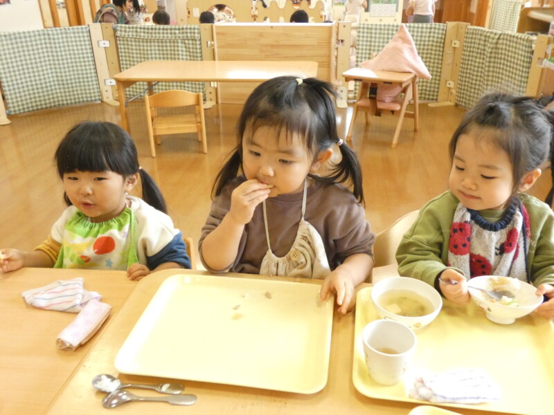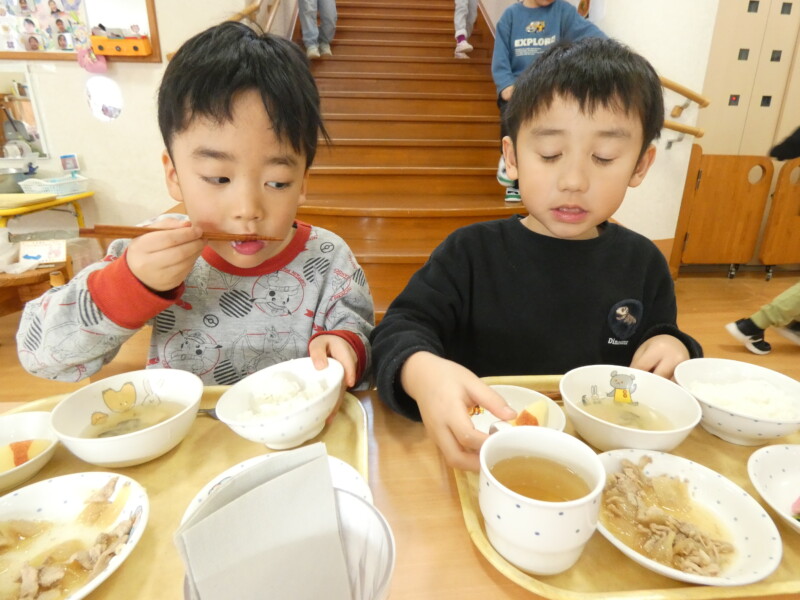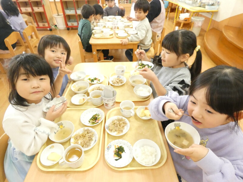 2月7日(土) 今日の朝は寒さが厳しかったが、日中は太陽ものぞいて良い天気になりました。今夜から明日の選挙にかけて「大荒れ」の天気になる予報ですが、選挙の結果も「大荒れ」になるのでしょうか。今日は泣いても笑っても「最後の追い込み」となります。候補者の皆さんは「人事を尽くして天命を待つ」心境でしょうが、明日の結果が気になります。 さて、本日は年長組の参加日でした。卒園式を除いて、年間事業計画最後の取り組みです。あと2か月で小学校の門をくぐる子供たちの成長を見てもらうための参加日です。今日は卒園制作の一環として文字に焦点を合わせたものになっています。保護者と一緒に文字の組み合わせを考え、表にしていました。完成品は後日、廊下踊り場の作品展示コーナーに展示しますのでご覧ください。今日の参加日は、「保育園の味」を確認してもらうために保護者のも試食していただきました。まさご揚げは豆腐が入っていてふわふわの食感で、「これおいしい~」という声が保護者からもあがっていました。寒い日は熱々の「豚汁」が食欲をそそります。スパサラダも緑の色合いが丁度良く、おいしく仕上がっていました。保護者の一部から「毎日こんなおいしい給食を食べているんだねえ、子どもたちは幸せだ」という声が聞こえていました。お腹いっぱいというわけにはいきませんでしたが、子どもの食べる量と同じくらいの量を試食してもらいました。そんな様子を見て、食育の大切さ、給食の重要性を改めて感じた園長でした。これまでの協力に心から感謝したいと思います。ありがとうございました。