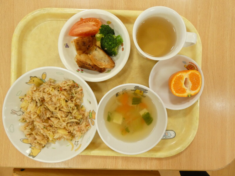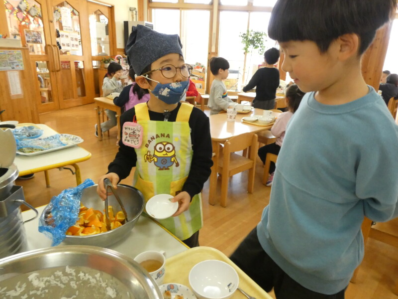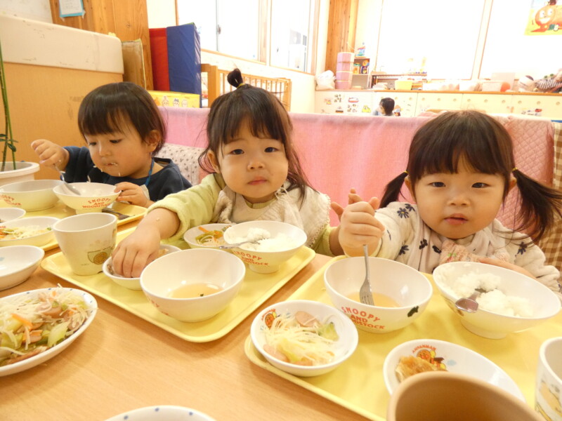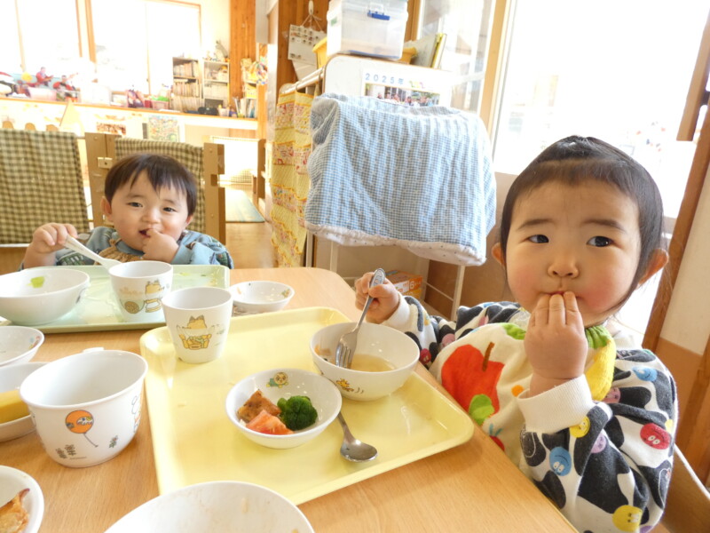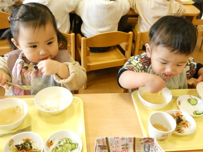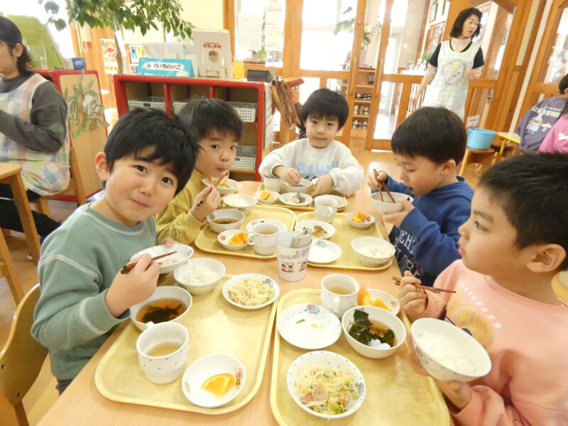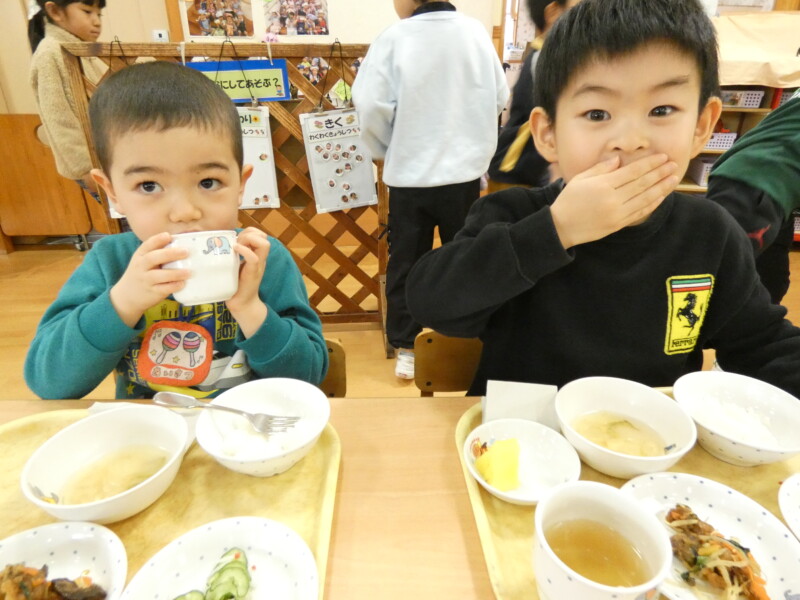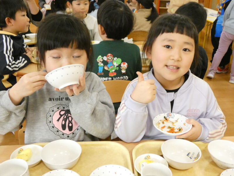 2月10日(火) カレーライスの日は、おかわりが早い。食べているのか飲んでいるのか・・。我が園には数多くのカレーのレシピがあるが、今日は「チーズカレー」。お好みで最後に刻んだチーズをかけたものだ。あくまでも「おこのみ」なので、「いらない」という拒否権はある。ちゃんと確認しないと「乳アレルギー」にひっかかる。注文を聞き、顔を見て確認し、食べる量も調整する。我が園は人数も多いので職員も大変だ。でも、このももりもりべる子どもたちを見ると食に対するたくましさを感じる。「食べることは生きること」を実感する風景だ。海藻サラダも勢いに乗ってパクパク。わかめとレタスが次々と子どもたちの口に入っていく。そこで、野菜委員会の登場。「今日のスープには白菜が入っています。ビタミンCがたっぷり入っていて、風邪の予防にもなります。おかわりをして食べてください。」という内容でした。ここ数日、我が園では胃腸炎や風邪が流行していています。白菜を食べてしっかり予防をしてもらいたいと思います。ちなみに、白菜スープにはきのこ(しめじ)もたくさん入っていました。どちらも体調を整えるのに貴重な成分が含まれています。