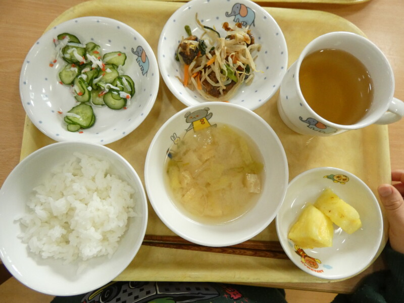 ニラレバ炒め 胡瓜とカニカマ酢の物 味噌汁(白菜・油揚げ) パイン お茶