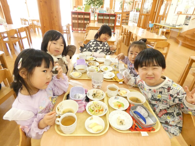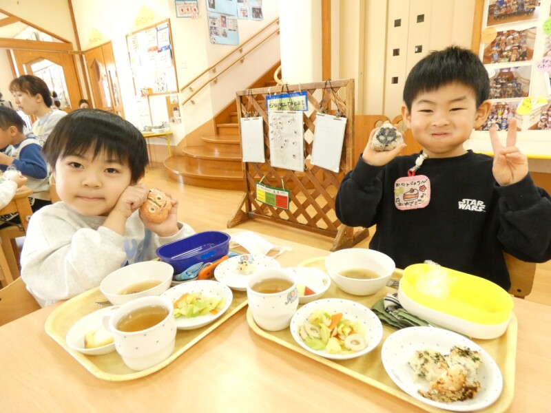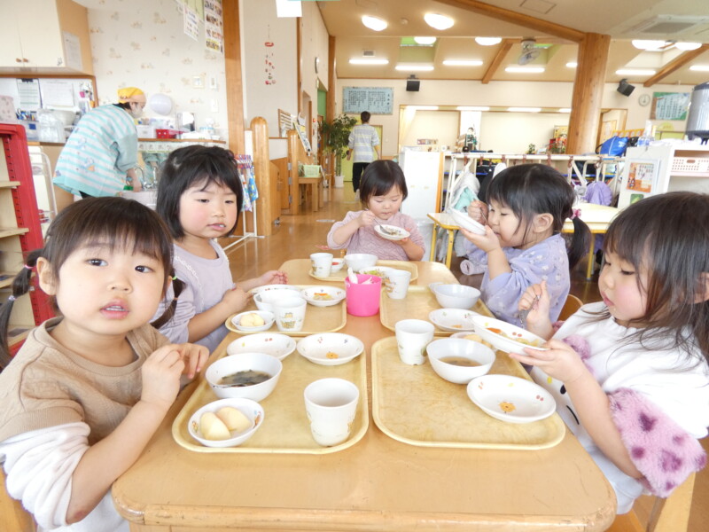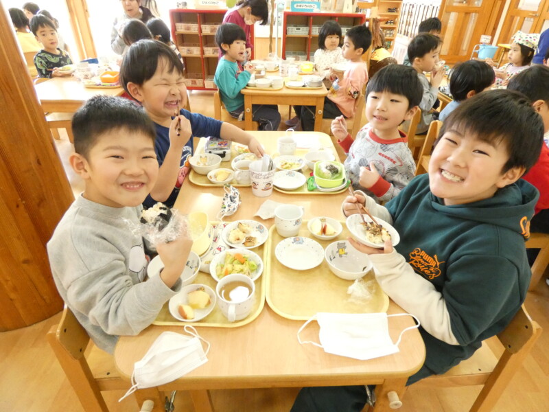 2月18日(水) 今日は『根城新組えんぶり組』の方たちをお招きした、えんぶり鑑賞会が行われました。2階のクラスでインフルエンザが流行中という事もあり、0,1歳児は2階へは行かないことになりましたが、えんぶり組の方たちのご厚意で、1階でも”えんこえんこ”を披露していただいたので、小さいクラスのお友だちも大喜びでした。今年は2名の園児と、小学生から大学生、大人になった卒園児も参加している事もあり、子どもたちはもちろん、先生たちも毎年楽しみにしています。根城新組えんぶり組のみんなさん、ありがとうございました。 さて、今日の給食は『鱈のパン粉焼き』でした。旬の鱈に、マヨネーズを塗り、パン粉をまぶしてオーブンで焼いたもので、隠し味にニンニクが少し入っているようです。この時期はスーパーにも並んでいることが多いので、ぜひご家庭でも作ってみてください。初登場の『キャベツと竹輪のお浸し』は食べなれないお友だちもいたようですが、さっぱりとしていておいしかったです。インフルエンザ警報発令中の園内ですが、旬の食材を食べて、のりきっていきたいですね。(若江)