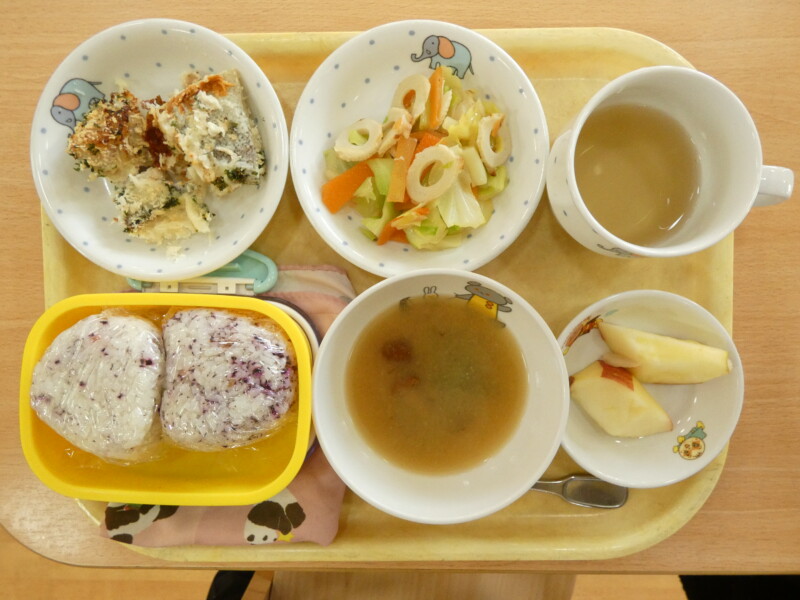 鱈のパン粉焼き キャベツと竹輪のお浸し 味噌汁(なめこ、わかめ) りんご お茶