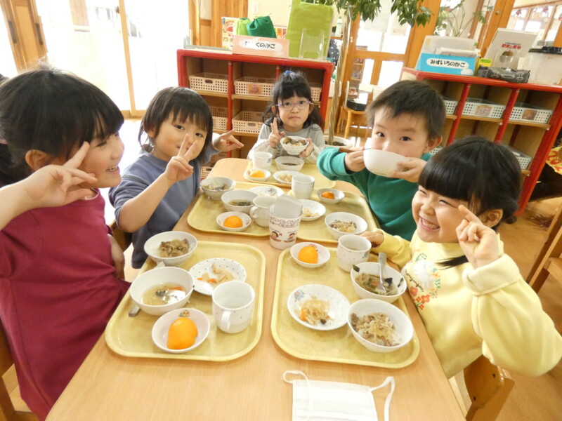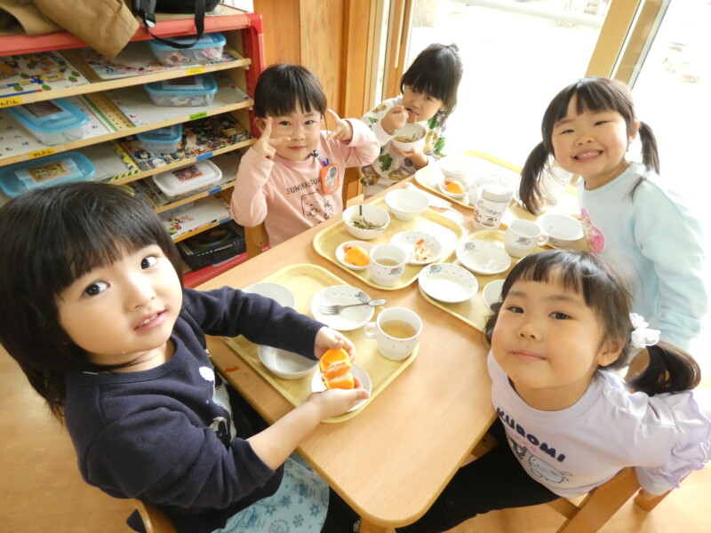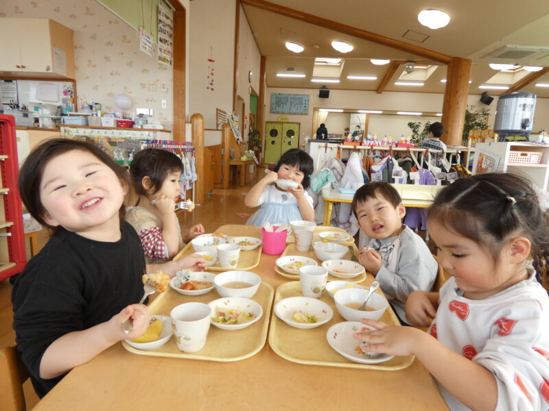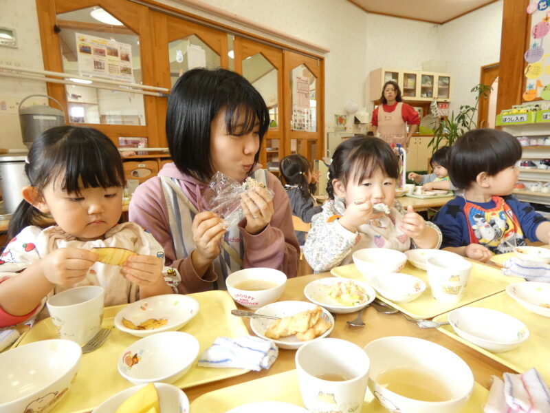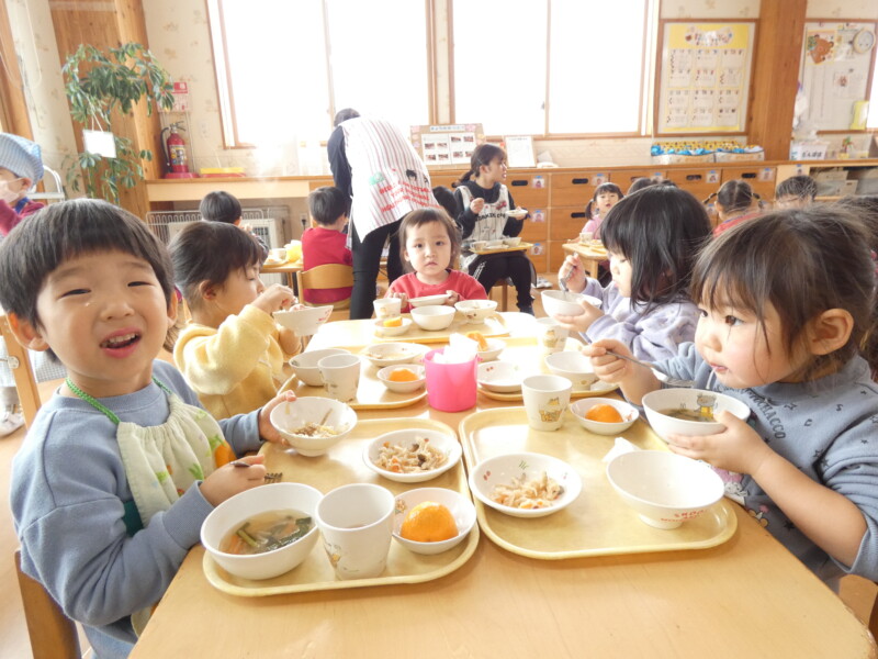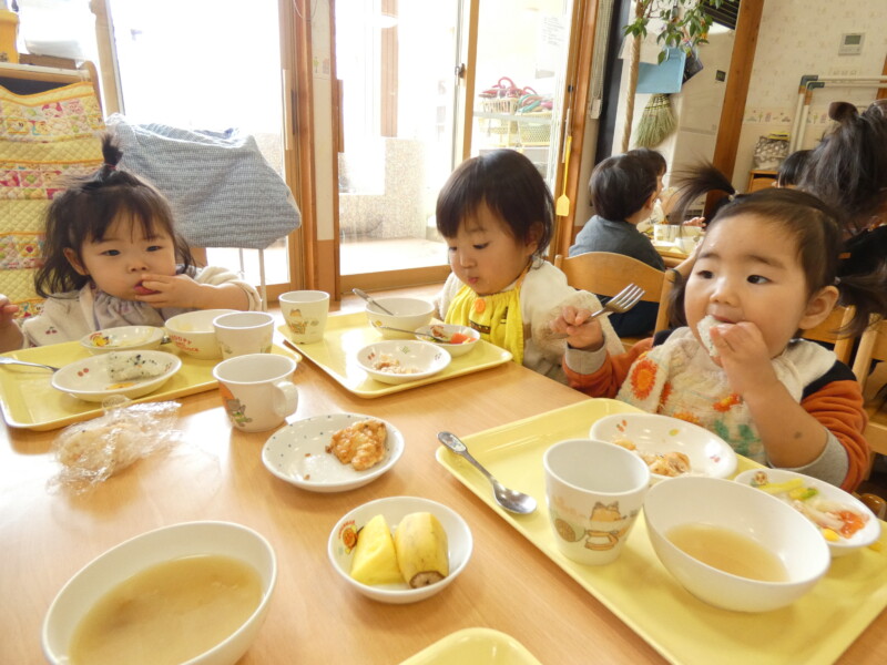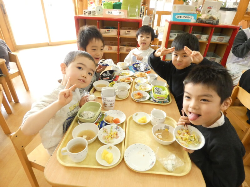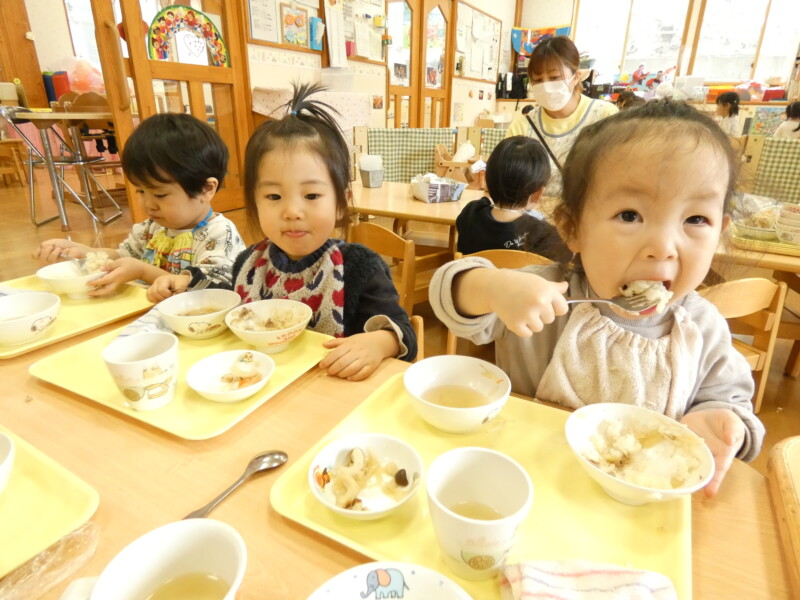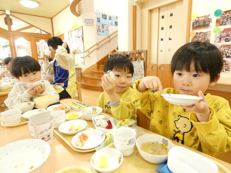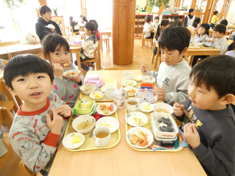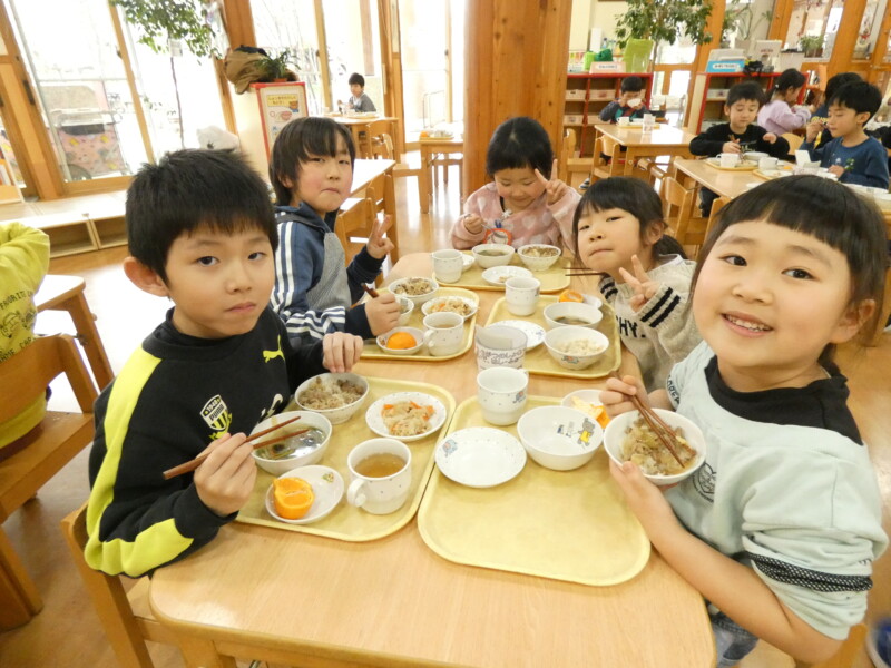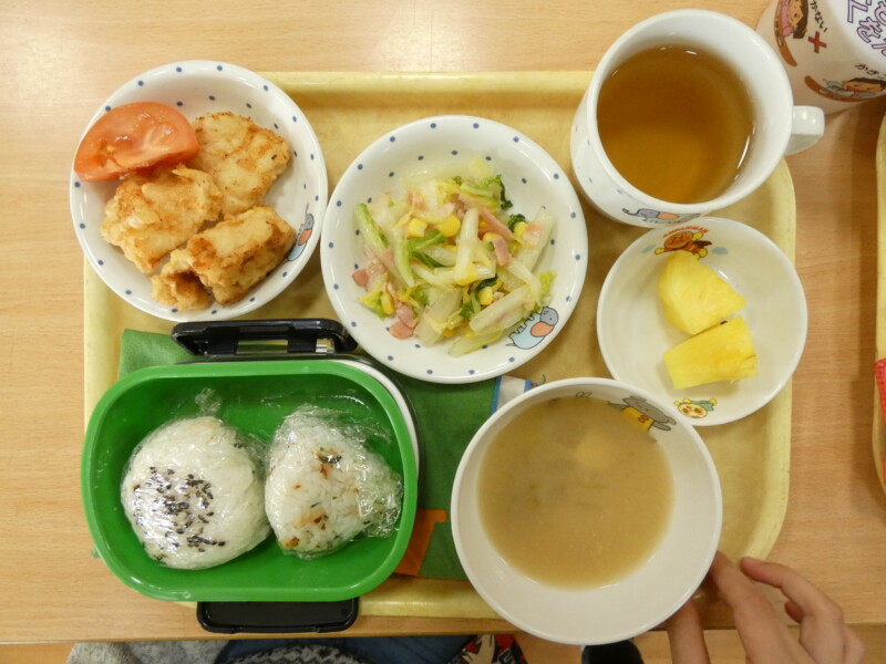 2月25日(水) 今朝は久しぶりに雪が降っていたので、子どもたちはウキウキ、大人はひやひやした朝になりました。 日中の日差しで道路の雪は解けたので安心ですが、まだまだ油断はできないかもしれません。 さて、今日の給食は『とり天』でした。衣がサクっとしていて、身は柔らかく「おいしい!」と食べているお友だちが多くいました。年長組の女の子は、ちょうど歯の生え変わりの時期で揺れていたこともあり「かめない・・・」と、少しずつずらしながら工夫して食べていました。今の時期ならではの悩みかもしれませんね。『白菜のコールスロー』は旬の白菜ということもあり、甘みがあり、ベーコンやコーンとの相性もばっちりで美味しかったです。白菜には風邪予防の効果もあるようなので、今の時期はたくさん食べて元気に過ごしたいですね。おにぎりの日と言う事で、3歳以上児のお友だちは家庭から持ってきたおにぎりを、0・1・2歳児のお友だちは給食の先生が作った、わかめおにぎりを食べました。2歳児の女の子は「おうちにアンパンマンのふりかけおにぎりあるんだよ」と話していました。4月からは3歳児になるので、手作りおにぎりの日が楽しみですね。(若江)