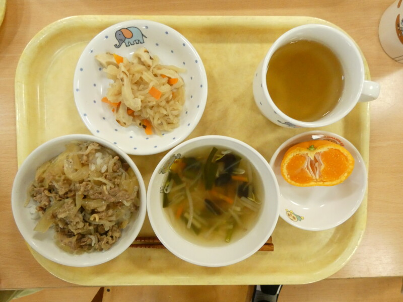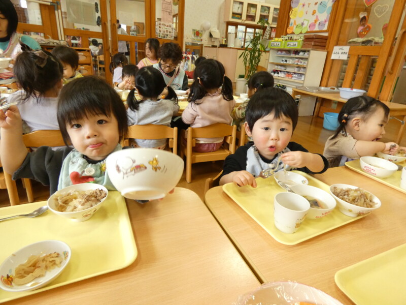 2月26日(木) 今日は散歩に出かけようとすると雨が降ってきてしまい、ジャンバーを着て準備をしていたお友だちが、「あめがふってきた!!」と少し低めの強い口調で話をしていました。声だけで、残念な様子が伝わってきて、散歩が好きなんだと感じました。明日の天気もあやしげですが、様子を見て散歩に行けるといいですね。 さて、今日の給食は、子どもも大人も大好きな『牛丼』でした。柔らかく煮た玉葱と糸こんにゃくも入り、大きく口を開けながらモリモリ食べていました。『春雨スープ』には、筍やきくらげ、もやしや人参、ニラなどのたくさんの野菜も入り、食べ応えがありました。小さいクラスのお友だちも、お椀を口に近づけ、ツルツルの春雨に逃げられないように食べていました。感染症の波も少しずつ落ち着いてきましたが、まだまだ油断禁物なので、しっかりと睡眠をとり、手洗いや水分補給をしながら対策をしていきましょう。(若江)