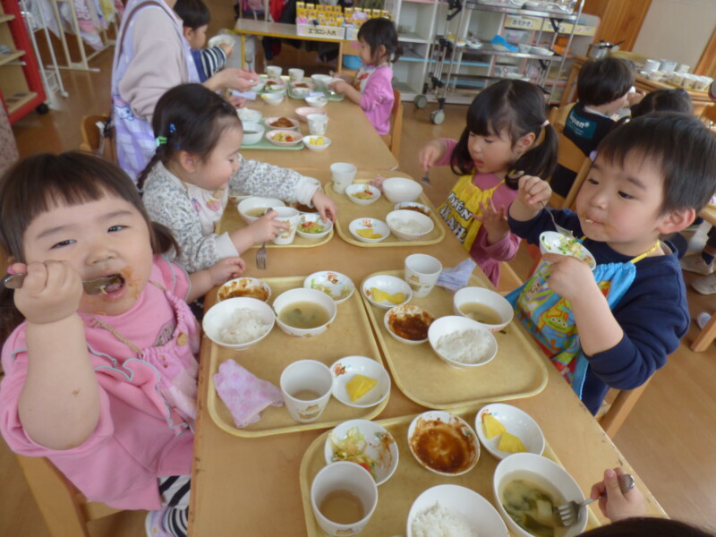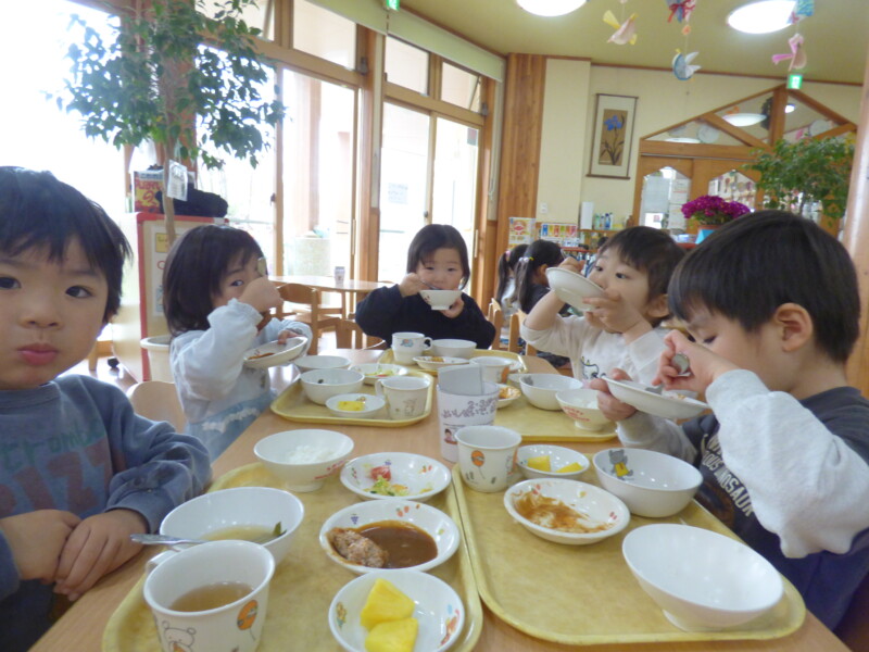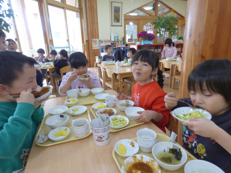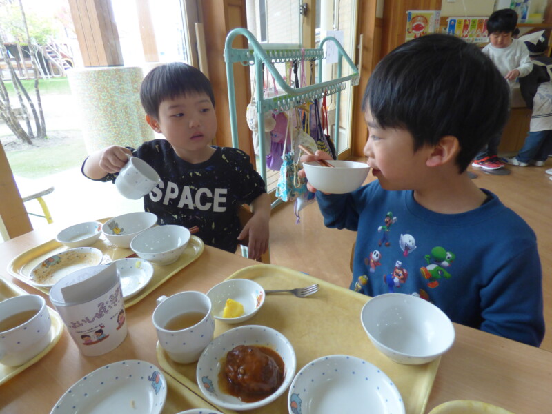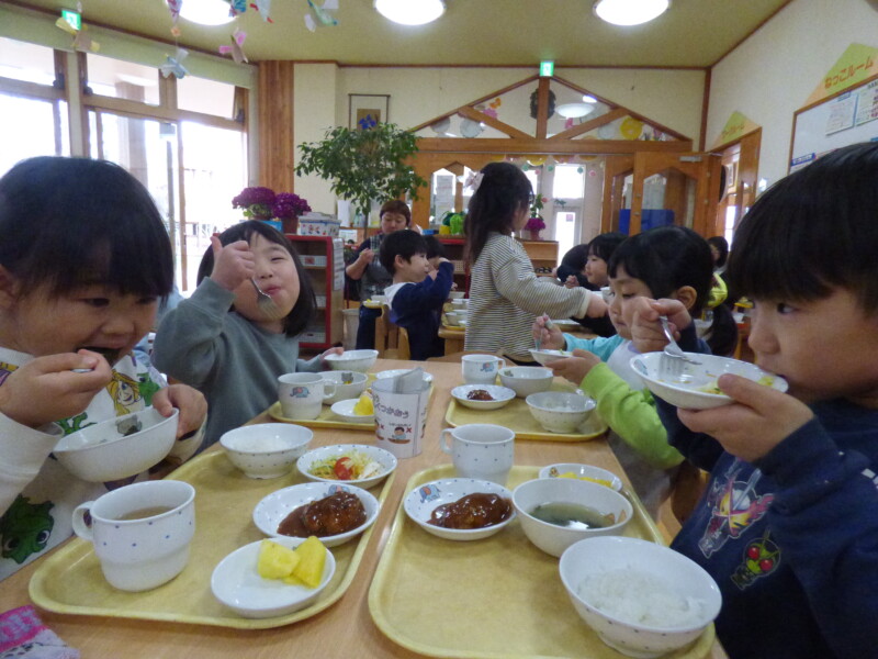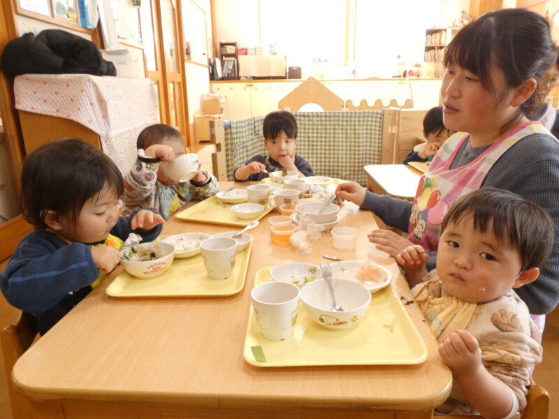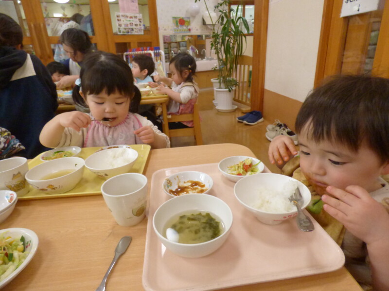 3月16日(月) 「園長先生、大変だあ。炊飯器のスイッチを入れ忘れていた」と調理員が朝から問題発言。どうやらご飯が炊けるまでいつもより食事時間が遅れるようだ。でも、急いだかいがあってほとんど変わらない時間に出来上がっていた。しかも、職員からは「いつもよりご飯がおいしい!」との声。それはそうでしょう、だって本当の「炊き立て」なんだもの。回鍋肉にはキャベツがたっぷり入り、みんなむしゃむしゃ食べていました。胡瓜と蒲鉾のマヨサラダは保育園の一番人気。おかわりの列ができているほどでした。すまし汁には、要望に応じて「とろろ昆布」が入っていて、上手にすくいながら「これおいしい~」と言って食べていました。土曜日に行った「卒園式」は、とても感動的でした。(詳しくはかわら版)校長先生方からもお褒めの言葉をいただき、自信になったようです。残り2週間、これまで通り落ち着いた保育園生活を送ってほしいものだと思います。最近のランチルームは「異年齢」での組み合わせが多く、写真を撮るのに苦労します。今後は異年齢での食事風景を掲載しようかなと思います。