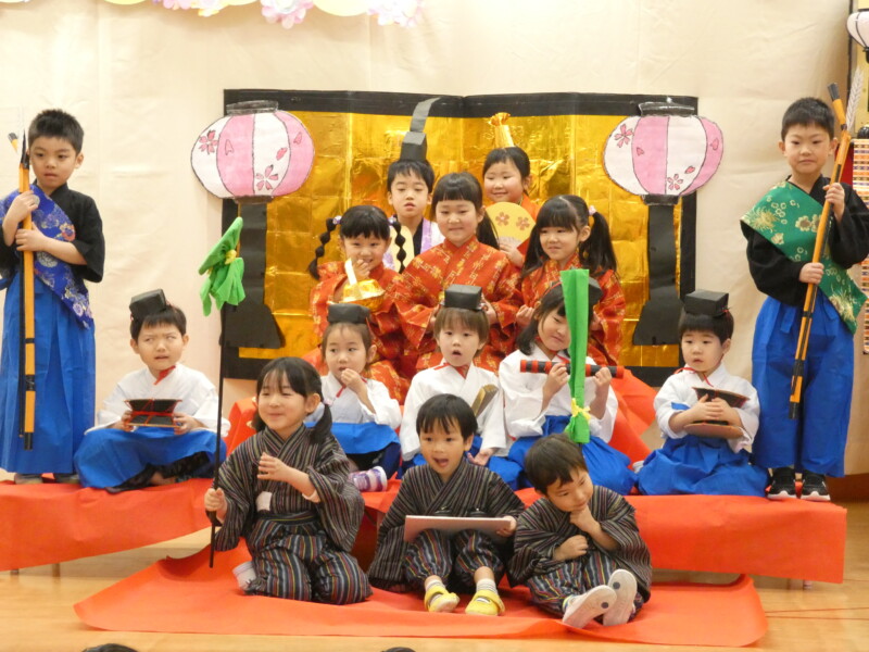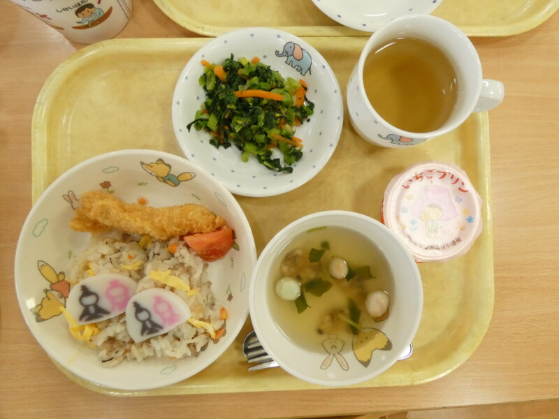 3月3日(火) 今日は”ひな祭り”と言う事で、保育園ではひな祭り誕生会が行われました。毎年恒例の”長坂ひな壇”では、お内裏様にお雛様、三人官女や五人囃子など「かわいいね」「かっこいいね」とお互いに着替えた姿を誉めあいながら、緊張した表情で入場していました。女の子の健やかな成長と健康、幸せを願う日ですが、保育園ではみんなの幸せを願いながら、3月生まれのお友だちの誕生日のお祝いをしました。さて、今日の給食は、ひな祭りにお馴染みの”ちらし寿司”を子どもたちにも食べやすいようにアレンジした『焼き肉ちらし寿司』でした。具材に牛肉が入り、上には卵とお内裏様とお雛様をモチーフにしたかまぼこものっていて、かわいかったです。『菜の花のお浸し』は苦みもなく調理されていたので、「おいしいよ~」と子どもたちもパクパク食べていました。お吸い物にはハマグリの代わりにアサリが入るなど、ひな祭りメニューを堪能していました。3月は卒園式やお別れ会などのイベントも多く、あっという間に過ぎていきそうですが、毎日を楽しく元気に過ごせるようサポートしていきたいと思います。(若江)