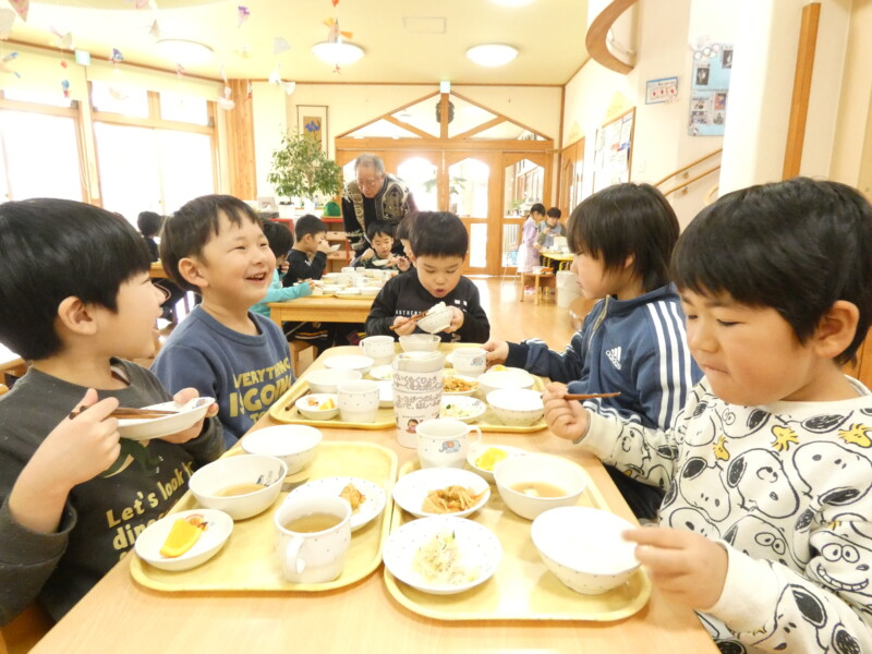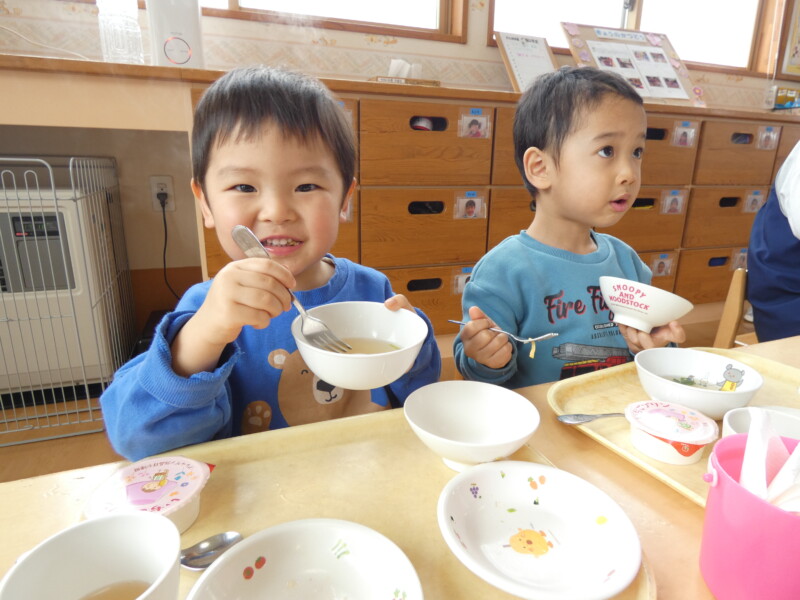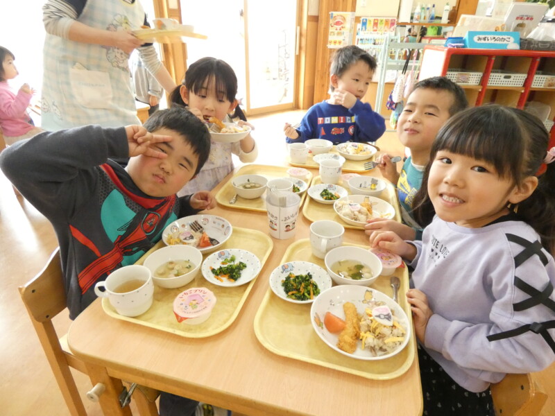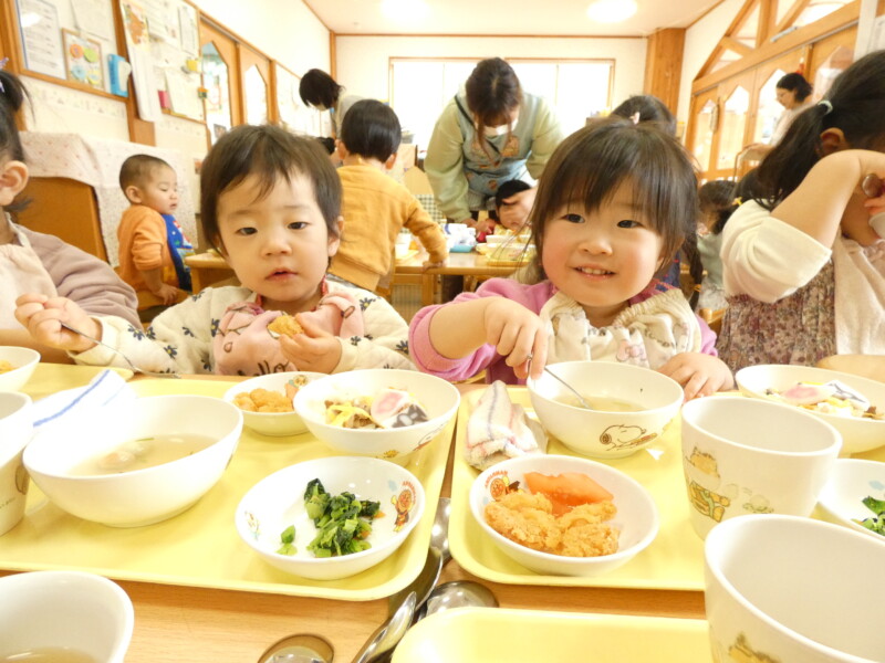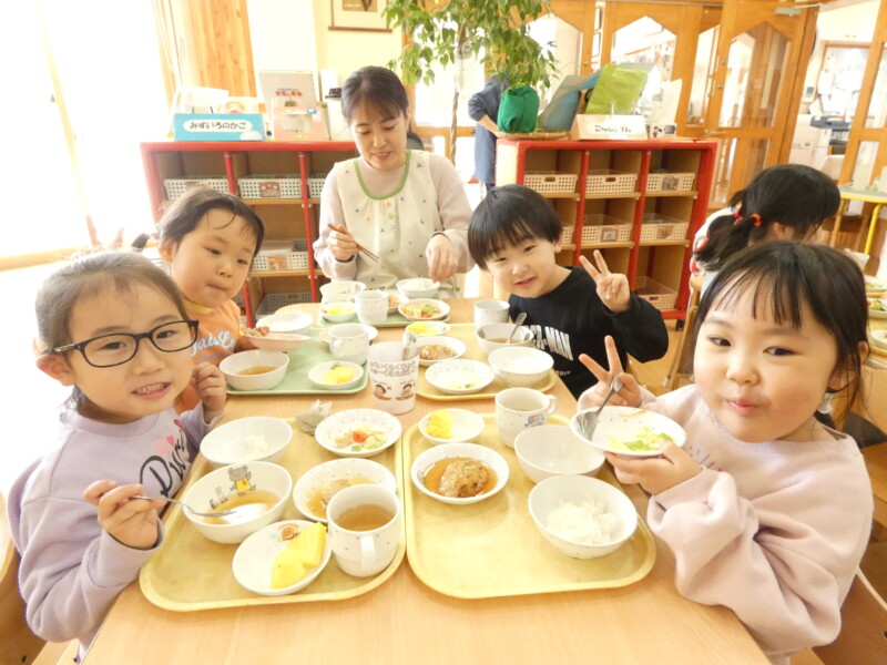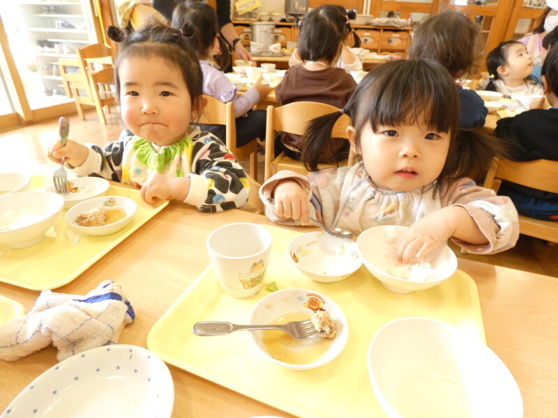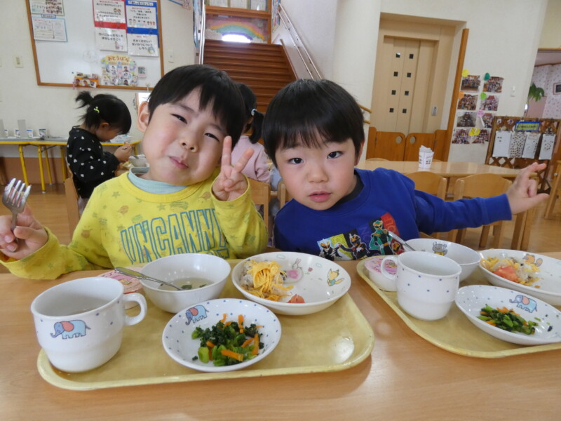 3月2日(月) 昨日から3月です。今日は春のようなあったかそうな空だな~、と思って朝外に出たら-1度でした。日中の日差しは暖かいのですが風はまだ冷たい。八戸の春はもう少し先のようです。 そんなまだまだ寒い八戸。今日は2歳児クラスの子がトイレから出たら、ばっちりトレーナーまでズボンの中に入れていました。「トレーナーはズボンから出そうか」と直してあげていると、「インフルにならないようにおなかしまってる!」と教えてくれました。家庭や園で聞いたことをしっかり覚えていて、2歳児さんなりに考えての行動だったんだな~と、理由を聞いてなるほど~!と、ほっこりしました。 さて、今日の給食はポークチャップでした。「これとこれを一緒に食べるとおいしいよ!」と、ポークチャップとご飯をほおばり、おいしそうに食べていました。口の周りを赤くしながら食べている子たちもいましたが、口ふきでしっかりと口の周りを拭いていましたよ。法蓮草の白和えは少し甘めの味つけです。見た目にも緑で野菜という感じでしたが、大きな口を開けて食べていました。いよいよ3月に入り、今のクラスもあと1か月。期待をもって進級・進学できるように、子ども達の気持ちを盛り上げていきたいと思います。(松田)