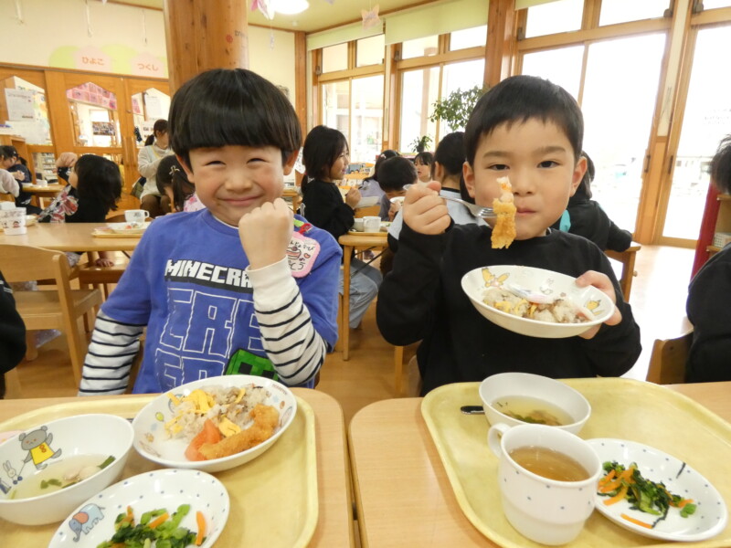 2月28日(土) 今日の給食はハムカツサンド。「一緒に食べたかったのにカツが先に出てきちゃったよ~」と言いながらもおかわりをしておいしそうに食べている子や、ハムカツサンドなのに「コロッケ美味しい!」と言っている子など、みんなおいしそうに食べていました。ツナ牛蒡サラダには、人参やキュウリなども入っていました。よく噛んで食べるので、子ども達のあごや脳にも良いサラダでした。 今日は、大きいクラスの子ども達は久しぶりに散歩にいきました。何人かの2歳児クラスの子たちとも合同で行ったようで、「たんぽぽさんの〇〇ちゃんと手をつないだよ」と教えてくれました。「僕、お散歩行ったからおなか減ったんだ!おかわりするよ!」と言っている子もいました。たくさん動いてたくさん食べて、長坂の子ども達はとても健康的です。今年度も残り1か月、元気に過ごしてほしいと思います。(松田)