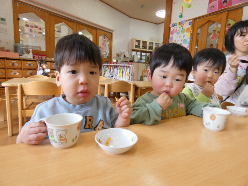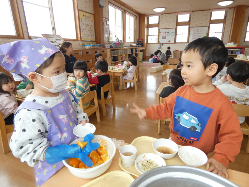 3月5日(木) 昨夜から降り始めた雪と、県立高校の入試日と重なり、今日はいつもの朝よりも道路が混雑していました。「雪遊びできる?」と登園してきたお友だちもいましたが、水分を多く含んだびちゃびちゃの雪だったので、遊ぶ間もなくあっという間にとけてしまいました。園庭の土が乾くまで、まだしばらくは遊べませんが、様子を見ながら散歩や戸外遊びを楽しんでいきたいと思います。 さて、今日の給食はチンジャオロースの牛肉が鶏肉にかわった『青椒チキン』でした。筍やピーマンなど子どもたちが苦手な野菜も入っていましたが、唐揚げ風の鶏肉がたくさん入っていたからか、モリモリ食べているお友だちが多くいました。2歳児クラスでは給食お当番さんのデザートの盛り付けがスタートしたようで、お友だちに「1個ですか?2個ですか?」と聞きながら盛り付けていました。それぞれのクラスで少しずつ進級に向けてステップアップしているようです。(若江)