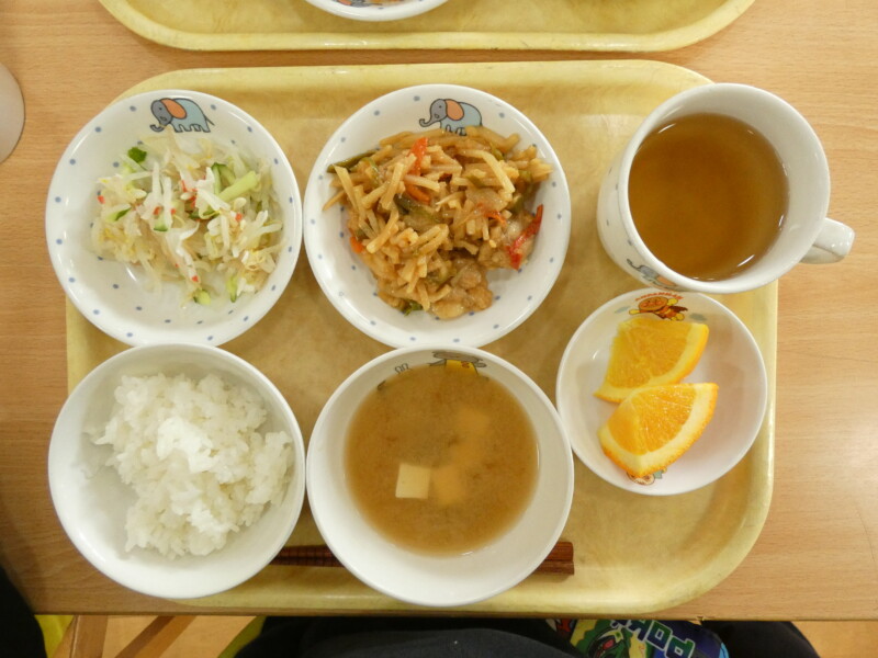 青椒チキン もやしとカニカマの酢の物 ごはん 味噌汁(大根、なめこ) オレンジ お茶
