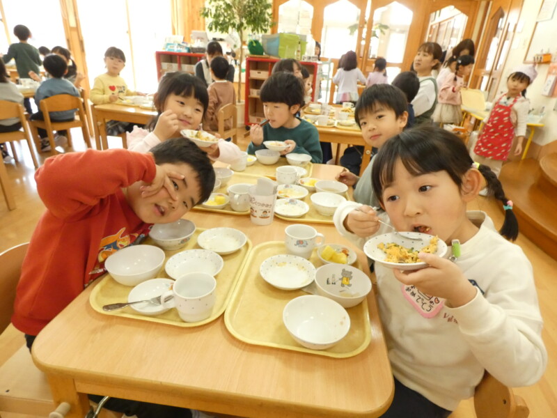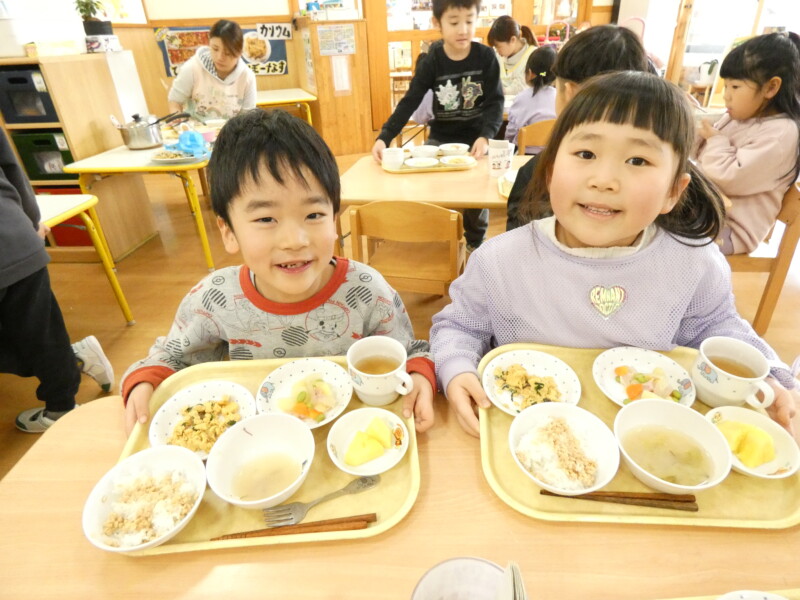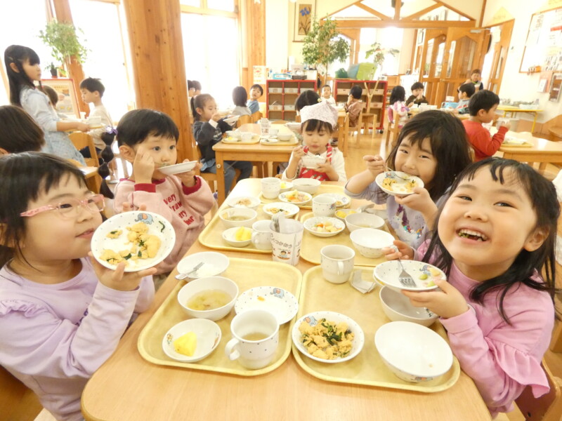 3月4日(水) 今日は朝からどんよりとした曇り空が広がり、時折雨がぱらつく天気でした。保育園では、2階のステージに飾られていたひな壇が片づけられ、卒園式に向けた紅白幕が飾られました。午後には、先生たちが卒園アルバムに写真を挟めるなど、着々と準備が進められています。子どもたちも、遊びながら卒園式の歌を口ずさむなど、少しずつ雰囲気が卒園式モードに変わってきていました。 さて、今日の給食は『茄子と豚肉の味噌炒め』でした。茄子や豚肉の他に筍や人参、インゲンなどの野菜も入り、少し甘めの味噌味で味付けされていました。『豆腐サラダ』には、レタスや水菜、ブロッコリーやカリフラワー、パプリカやミニトマトなどの野菜がたっぷりと入り、栄養満点でした。スープにもキャベツなどが入っていたので、野菜がたっぷりのメニューでした。今日はおにぎりの日だったので、弁当箱を開けるとおにぎりを見せ合いながら「ぼくは、ごま!」「ぼくは、のりだよ!」と会話が盛り上がっていました。2歳児クラスのお友だちも、指についたご飯粒を一粒ずつ食べている様子が、とてもかわいらしかったです。(若江)