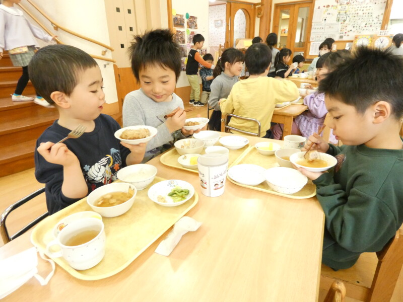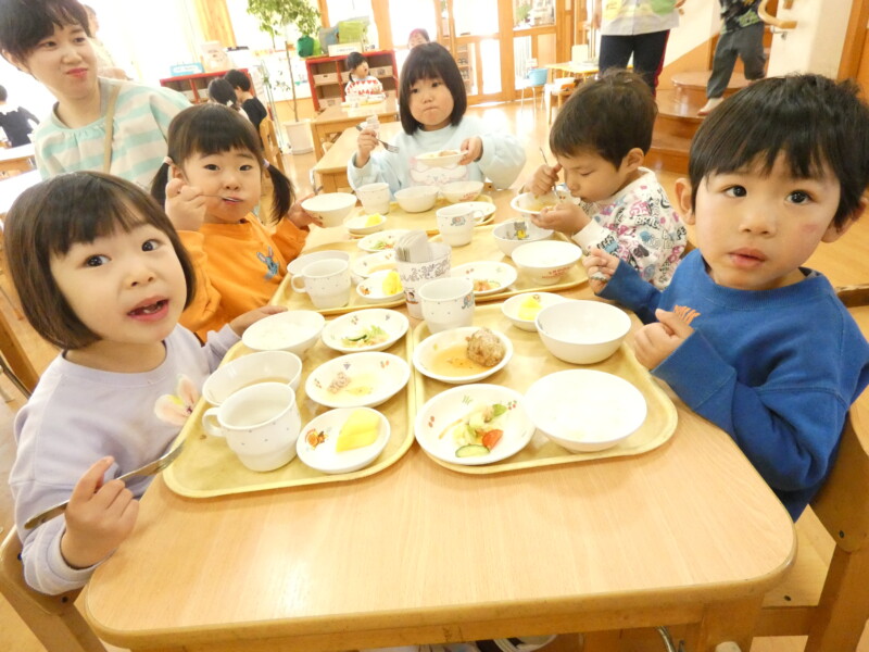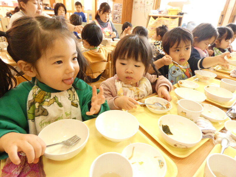 3月10日(火) 今日は卒園式の総練習が行われました。背筋を伸ばし立派に歩く姿に、入場から胸が熱くなりました。練習が終わると、ホッとした様子で「緊張した」「感動した」と友だち同士で話す姿も見られ、子どもたちなりに様々なことを感じながら練習に参加していたようです。あとは本番まで体調を整えながら、みんなではれの日を迎えられるよう準備を万全にしていきたいと思います。 さて、今日の給食は大根や人参、ネギやひき肉などがたっぷりと入っていた『野菜そぼろ丼』でした。丼ぶりメニューは食べやすく、子どもたちにも人気があり、大盛りやおかわりをして食べているお友だちが多くいました。『鶏汁』もごぼうなどの野菜や鶏肉からの出汁が出ていておいしく、写真を撮っていると「先生!おつゆおいしいよ!!」と教えてくれたお友だちもいました。おかわり用に出していた鍋も、あっという間に空になるほど人気もありました。今日は天気も良く、戸外で遊んだお友だちも多くお腹も空いたようで、食欲旺盛なお友だちが多かったです。(若江)