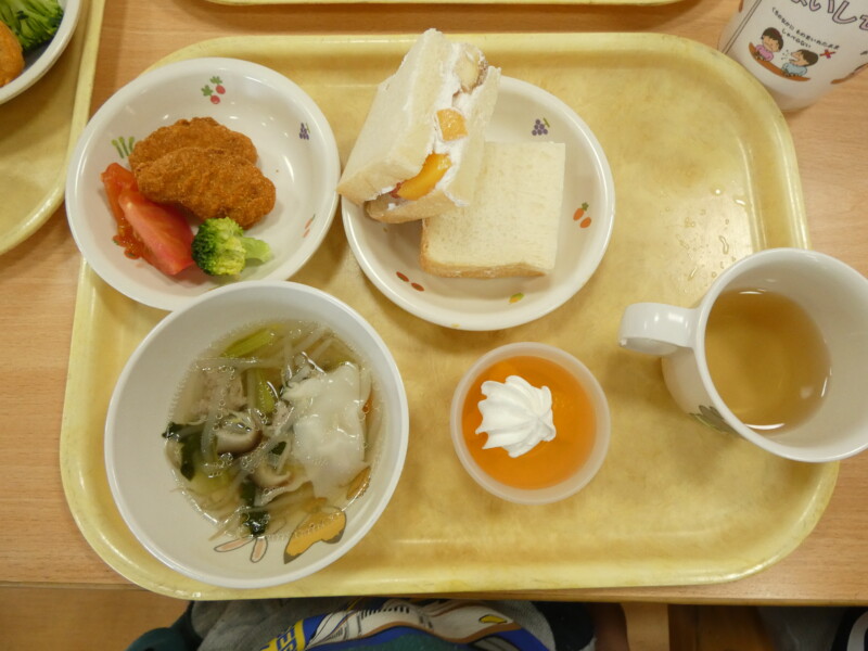 フルーツサンド チキンナゲット 雲吞スープ みかんゼリー お茶