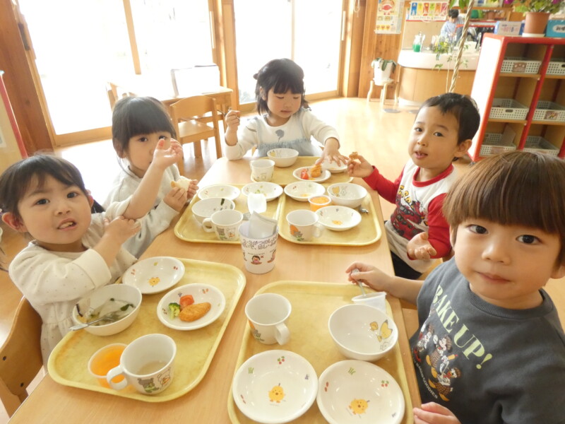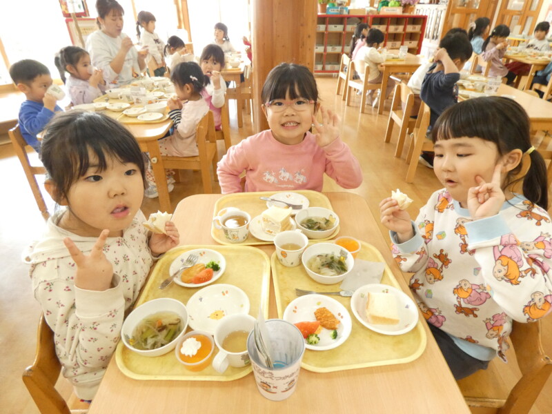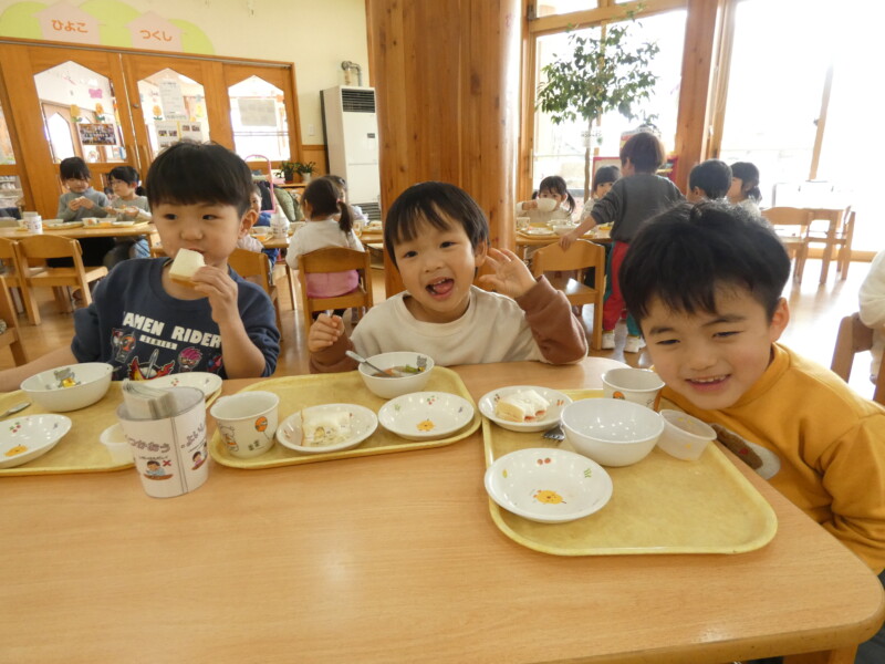 3月19日(木) 今日は多くの小学校で卒業式が行われ、長坂保育園にも沢山の卒園児が晴れ姿を見せに来てくれました。中学校の制服姿の男の子や袴を着た女の子など、久しぶりに会った友だち同士、少し照れた様子で話したり写真を撮ったりしていました。6年間で大きく成長した子どもたちの中には、当時の担任の身長を10センチ以上も上回り、少し見下ろしている姿もありました。卒業おめでとうございます。みんな、会いに来てくれてありがとう! さて、今日は給食を食べに来た3歳児の女の子たちが、階段を降りながら「今日はパスタかな?ナポリタンかなぁ?」と給食の匂いで予想をしていたようです。ケチャップの匂いでそう感じたようですが、正解は『酢豚』でした。おかわりに来たお友だちの中には「パイナップル入れて下さい」「お肉いっぱいがいい」と話しているお友だちもいました。『白菜とえのきの おかか和え』は、野菜にたっぷりのおかかが混ざっていたので、旨味が野菜になじみ美味しかったです。お友だち同士の仲が深まり、一緒に座りながら好きなキャラクターの話をしたり、アイドルの決めポーズをしたりと、とても楽しそうに食べていました。(若江)