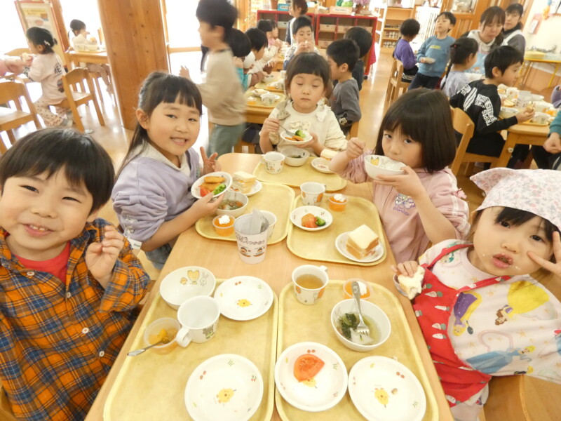 3月21日(土) 朝、家のカーテンを開けると雪が積もっていた。「彼岸じゃらく」と呼ぶ湿った重い雪だ。5センチほども積もっただろうか。桜のつぼみが膨らんできたな、と思っていたが、ピンクの桜ではなく、白い雪の華が咲いてしまった。テレビでは「桜前線」の話題で盛り上がっていた。今年は仙台が4月1日、弘前は4月17日の予報だ。八戸は中をとって4月10日前後だろうか。彼岸じゃらくが来たので確実に春が近づいている。今日は令和8年度の「父母の会総会」が午後に行われる。ルール違反的な行事の組み方だが、いろんな意味で効果があるようだ。ちなみに入園進級式は4月3日に行う予定だ。 さて、今日の献立は「フルーツサンドイッチ」と「雲吞スープ」「チキンナゲット」だった。サンドイッチには、バナナ、イチゴ、みかんなどが生クリームに挟まれて出てきた。結構豪華なつくりだ。ほとんどの子が2個以上食べていた。チキンナゲットとブロッコリー、トマトはあっという間に食べつくしていた子どもたちでした。さあ、来年度に向けてあと10日。何とか無難に乗り越えたいものだと思います。