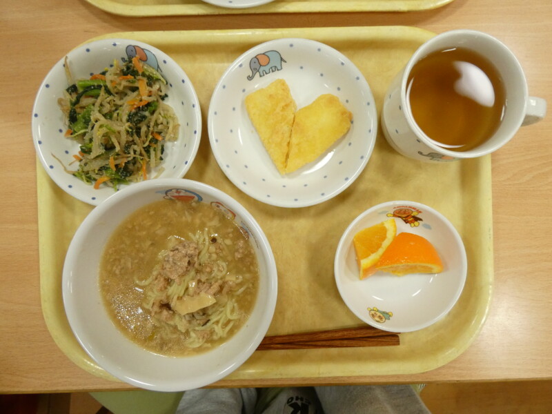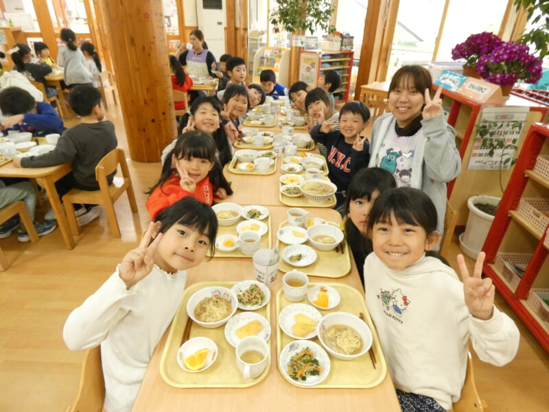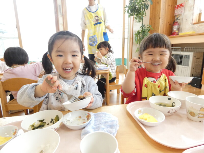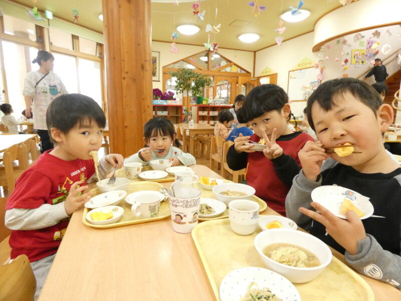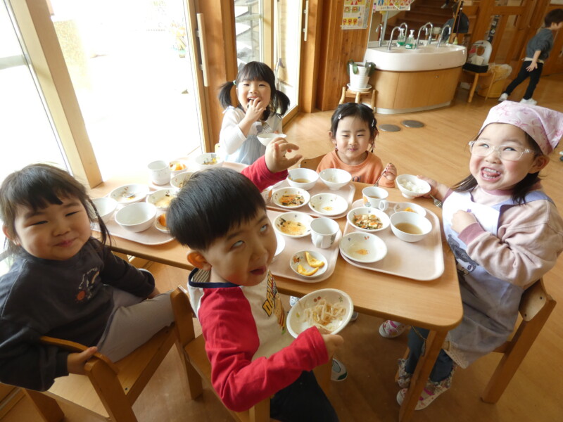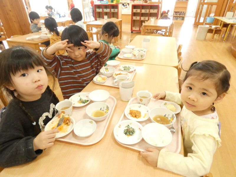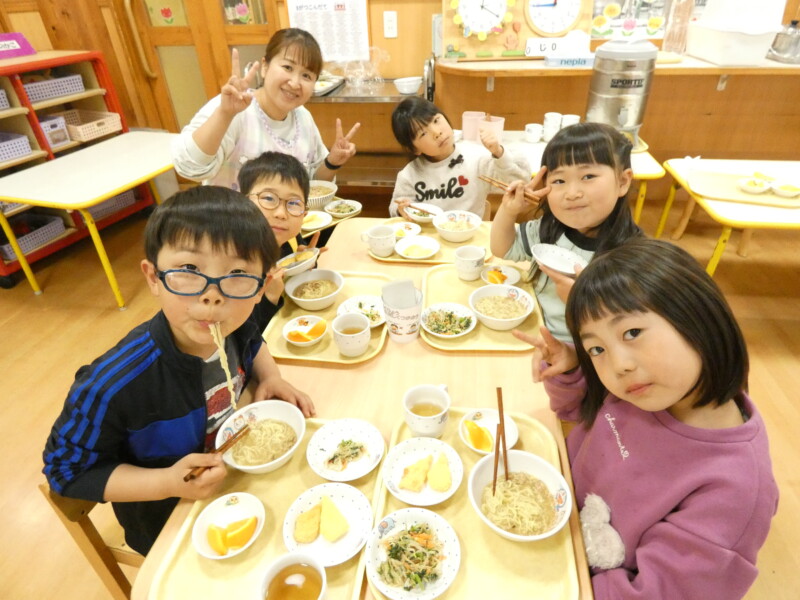3月31日(火) 今日で3月が終わります。年長組のお友だちの中には「あぁ~最後の日になっちゃった…」と登園する姿もあり、寂しさが伝わってきました。今日の給食は年長組、人気ナンバーワンメニューの『じゃじゃ麵』でした。大盛でもらうお友だちが多く、ほとんどのお友だちがおかわりをして食べていました!給食の先生も、全員がおかわりできる量を準備してくれていたので、みんな大満足だったようです。『いか天』は、”2個”と言ったお友だちの盛り付けがハート型になっていて、見た目にもかわいらしかったです。人参やもやしなどの野菜もはいった『ほうれん草の胡麻和え』も人気があり、胡麻もたっぷりと入っていて美味しかったです。今日の写真は、年長さんの特集号としてみました。小学校へ行ってもたくさん食べて、たくさん遊んで、たくさん友だちを作って、元気に過ごしてほしいと思います。長坂保育園はいつまでも、みんなのことを応援しています!(若江)