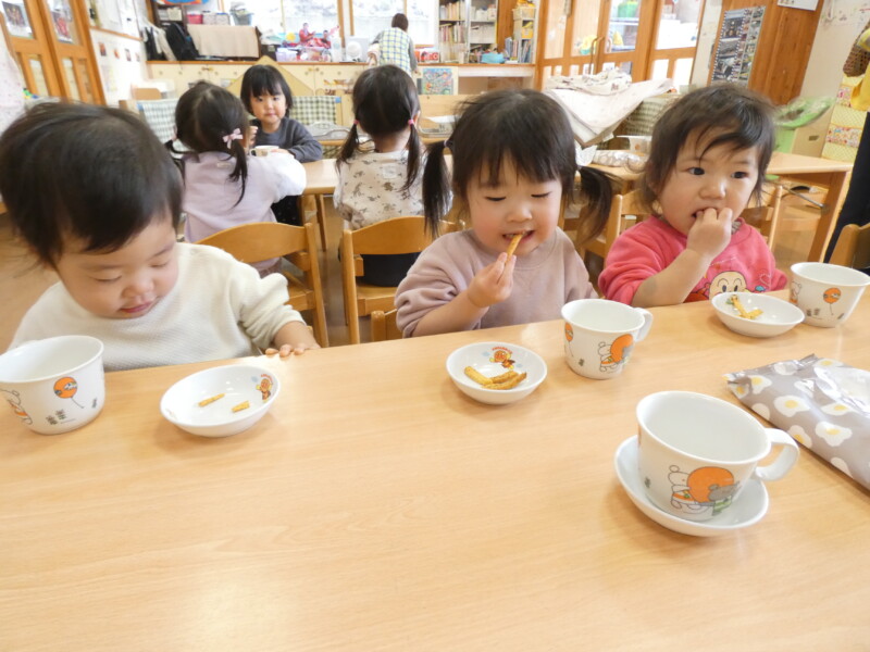 3月6日(金) 今日は昨日とはうってかわり、天気がよくポカポカ温かい日でしたね!散歩や園庭で遊ぶクラスが多く、「先生!ジャンパー脱いできまーす!」と、たくさん体を動かして汗をかいている子が多かったです。 来週の14日(土)は卒園式があります。「あと5回練習したら本番だよ!」と、友だち同士で話し「あと5回なんだってよ…緊張するよね~。私のお母さんきっと泣くと思う!」と、卒園式の話で盛り上がっていました。 歌の練習では毎回ウルウルしながら歌う子も。 きくぐみの保護者の方、当日は保育園生活で一番かっこいい姿をぜひお楽しみください! さて今日の給食の「洋風肉じゃが」は、コンソメ味で子どもたちにはとても食べやすい味付けになっていました。「ニラ玉」はきくらげが入っていて、歯ごたえもとてもよかったです。 今日の午後のおやつは手作りの「やさいポッキー」。 人参がすりつぶされ、トマトジュースで生地を伸ばしたそうです。給食だけでなく長坂はおやつも手作りが多く、調理員のオリジナルと工夫がされたものがよく出ます! (佐々木綾乃)