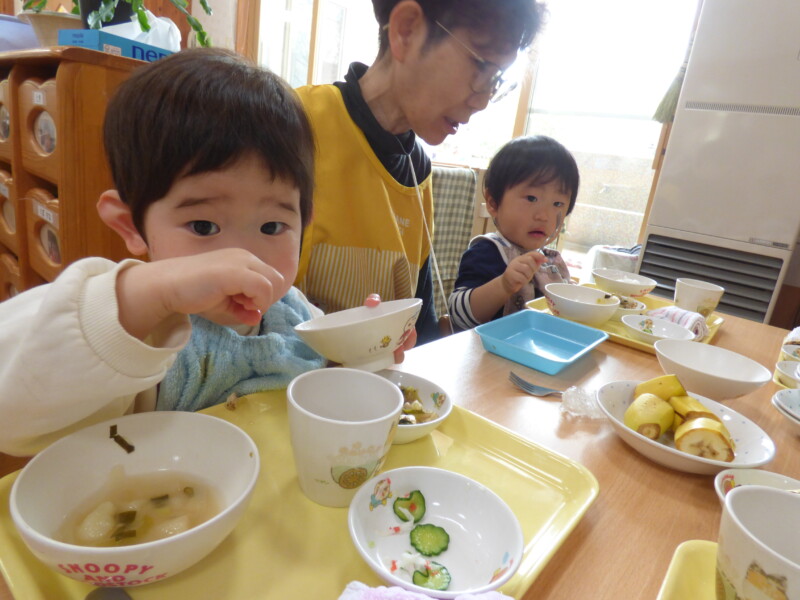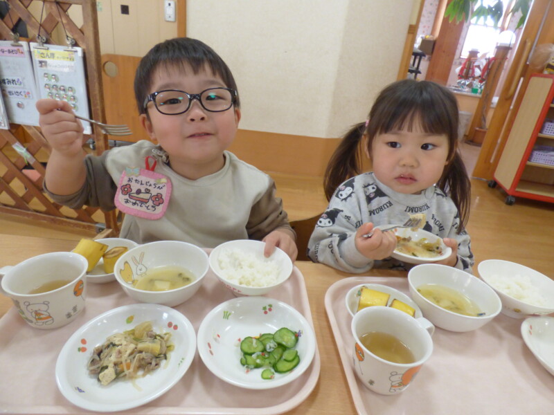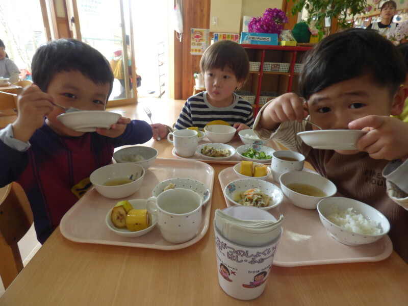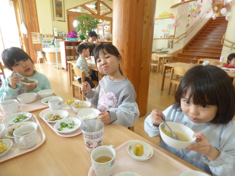 4月6日(月) 今日は園庭にクローバーの種をまきました。昨年度いった研修で学んだたい肥を土にまぜて、子ども達に種をまいてもらいました。お手伝い好きの子が多いので、「私もやる!」「ここにはまかないの?」と、進んで行ってくれました。今週は種まき週間にしようと思っているので、興味のある子ども達と一緒に園庭の環境を作っていきたいと思います。将来的に、子ども達が摘んで遊べるように、砂や土だけではない、草花もいっぱいの園庭にしていきたいなあと思います。「こうすれば花が根付くよ!」など知っている方がいらっしゃったらぜひ教えてくださいね。 さて、今日の給食はすき焼き、キュウリの酢の物でした。私にはすき焼きの感想よりも、「この胡瓜おいしい!」の声が多く聞こえてきました。さっぱりとした味付けで、ぱりぱり食感でおいしかったですよ。じゃがいもと玉ねぎの味噌汁は甘みがあっておいしかったです。外で顔や手を真っ黒にして遊んでいるので、たくさんおいしい給食を食べてほしいと思います。(松田)