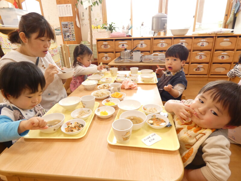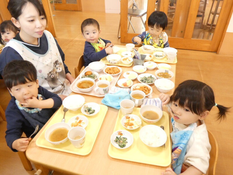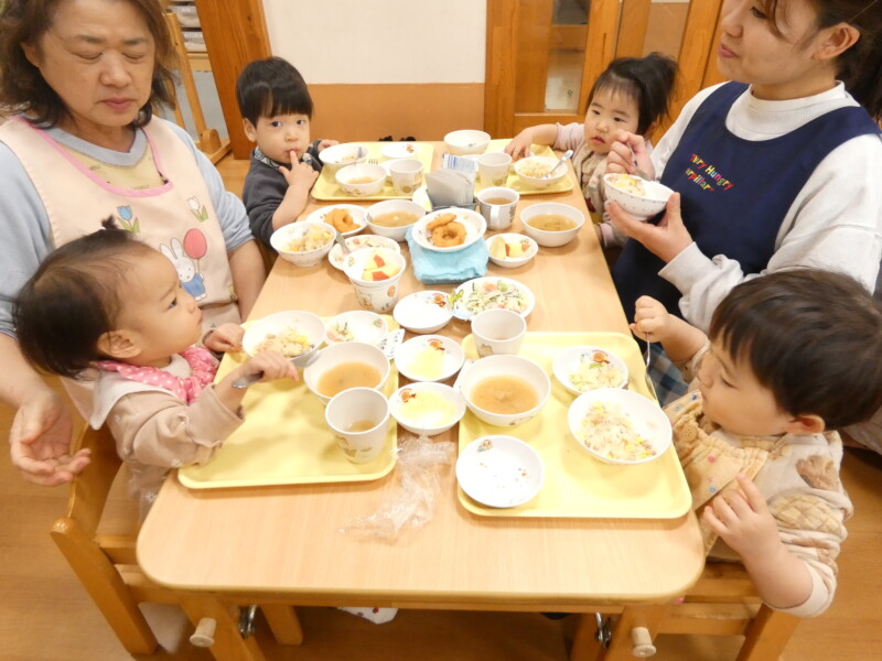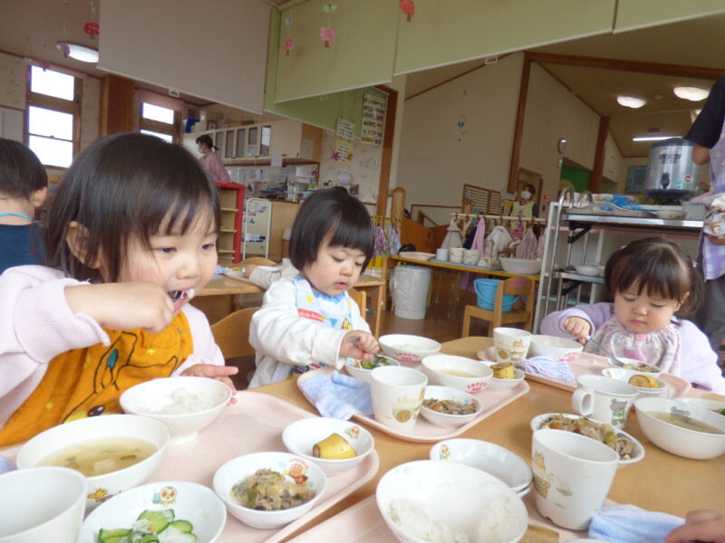 4月1日(水) 今日から令和8年度が始まりました。昨日の夕方は、卒園児たちが涙涙の最後のお別れでした。退職する職員も最後の仕事をして、玄関でたくさんの拍手を贈られました。そして3月の別れの後には出会いの4月がやってきました。昨年とほぼ同じくらいの入園の数なのですが、例年より泣き声も少なく静かな新年度を迎えています。給食を食べる新入園児は、そんなに多くはありませんが、担任が寄り添い食べ方を確認していました。最近はアレルギー食の対応が難しく、一人一人の情報を確認しながらの給食です。今日から、食器やトレーが新しくなり、アレルギー対応の子の食器も新しくなりました。新年度の一日目は水曜日のおにぎりの日になっていました。2歳児から進級した子どもたちは初めての「お弁当」に朝からウキウキ。お母さんやお父さんが心を込めて作ってくれたおにぎりをいとおしそうに食べていました。今年も力作が何点か見られ、子どもたちの会話に花が咲いていました。これから一年、よろしくお願いいたします。さて、本日の献立は「唐揚げ」と「ツナマカロニサラダ」でした。おにぎりの日は、どんなに豪華なメニューでもお母さんの手つくりおにぎりには敵いません。でも結構お代わりをしているようでした。今年もいっぱい食べて、ぐっすり眠り、元気に躍動してほしいと思います。今年もよろしくお願いいたします。