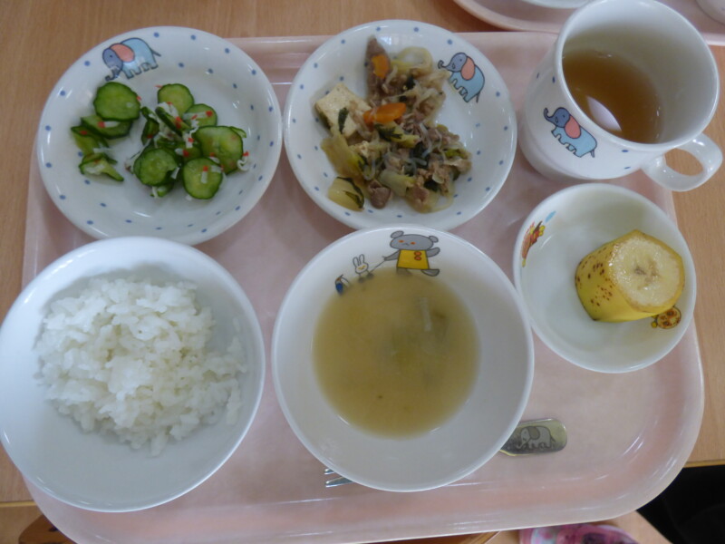 すき焼き 胡瓜とカニカマの酢の物 味噌汁(じゃがいも、たまねぎ) バナナ お茶