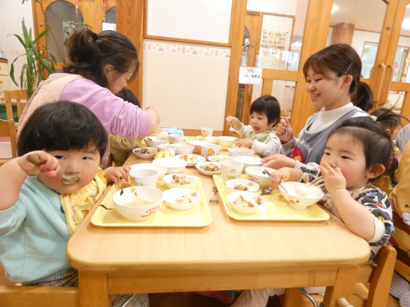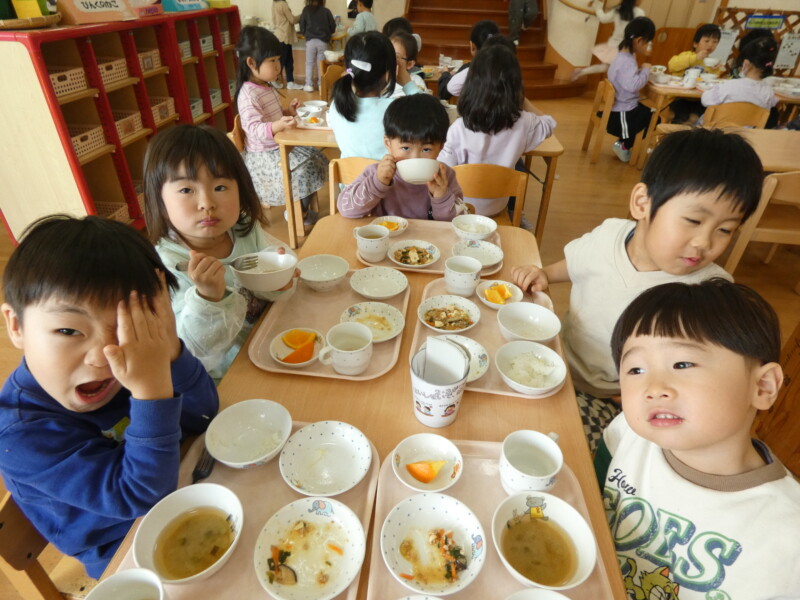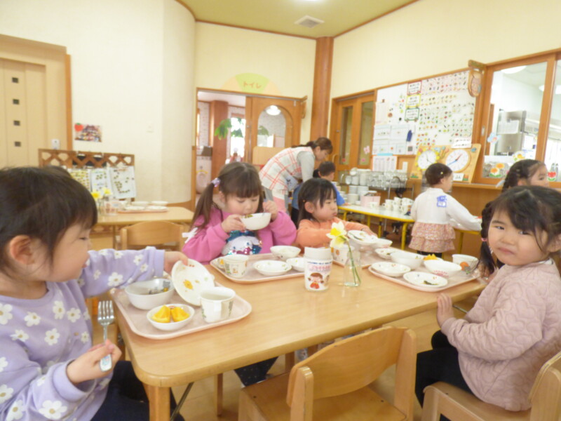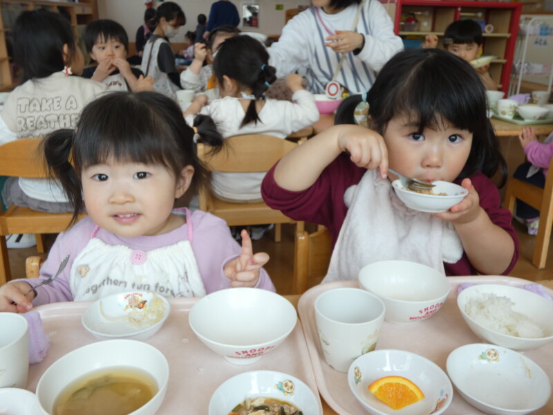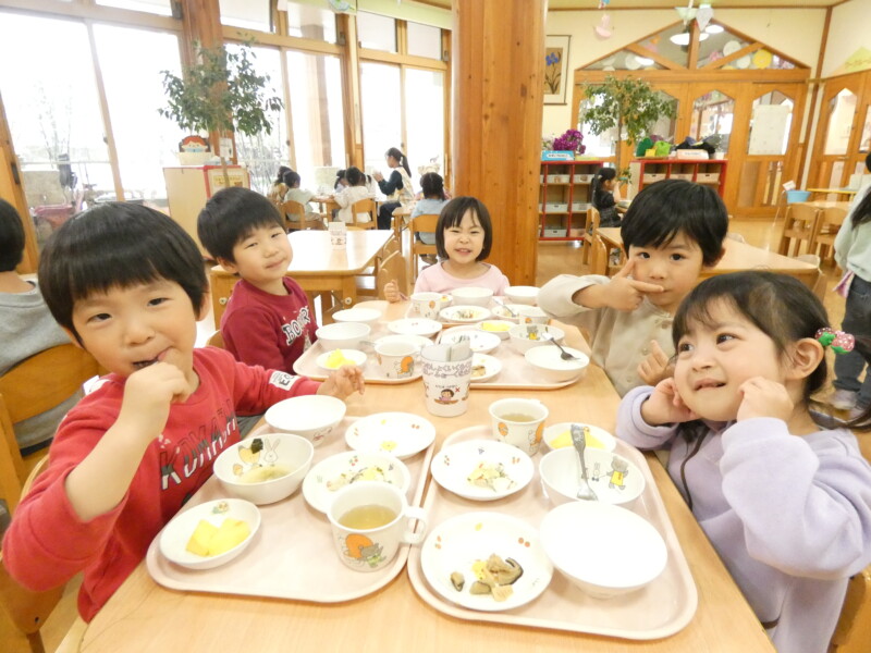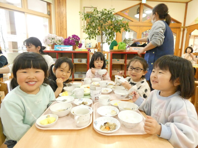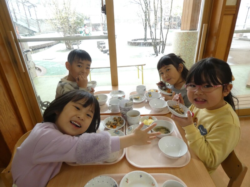 4月2日(木) 今日は朝から雨が降っていましたが、10時くらいからはみぞれから雪に変わりはじめました。昼過ぎに2階の窓から外を見ると、4月とは思えないほどの雪景色が広がっていました。給食中、卒園した新1年生の事を話していたお友だちが「春休みじゃなくて、雪休みだね」と言うほど、園庭も真っ白になっていました。保育園では明日、入園進級式が行われるので天気が心配になりますが、また春の温かさが戻る予報なので、青空を期待したいと思います。 さて、今日の給食は『鱈のチーズ焼き』でした。食べやすいサイズに切られた鱈の上に、たっぷりのチーズとピーマンやパプリカがたっぷりとのっていて、彩もきれいでご飯も進む一品でした。『筑前煮』は縁起の良い家庭料理と言われ、入園進級式前にぴったりのメニューでした。味噌汁には玉葱と油揚げの他に、小松菜も入ったので栄養もボリュームも満点でした。寒かったり温かかったりと、季節の変わり目は体調を崩しやすいので、栄養のあるものを食べ元気に過ごしたいですね。(若江)