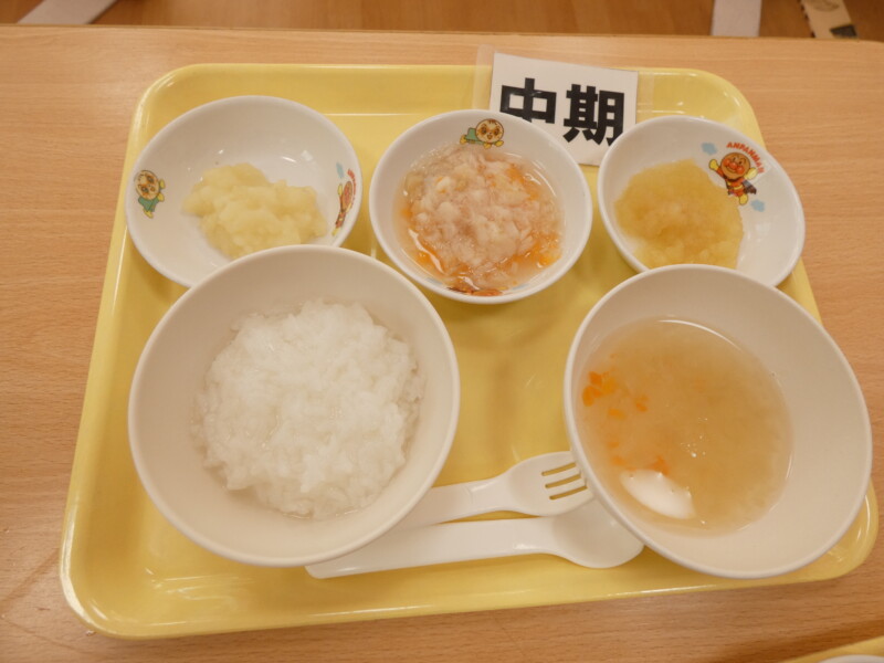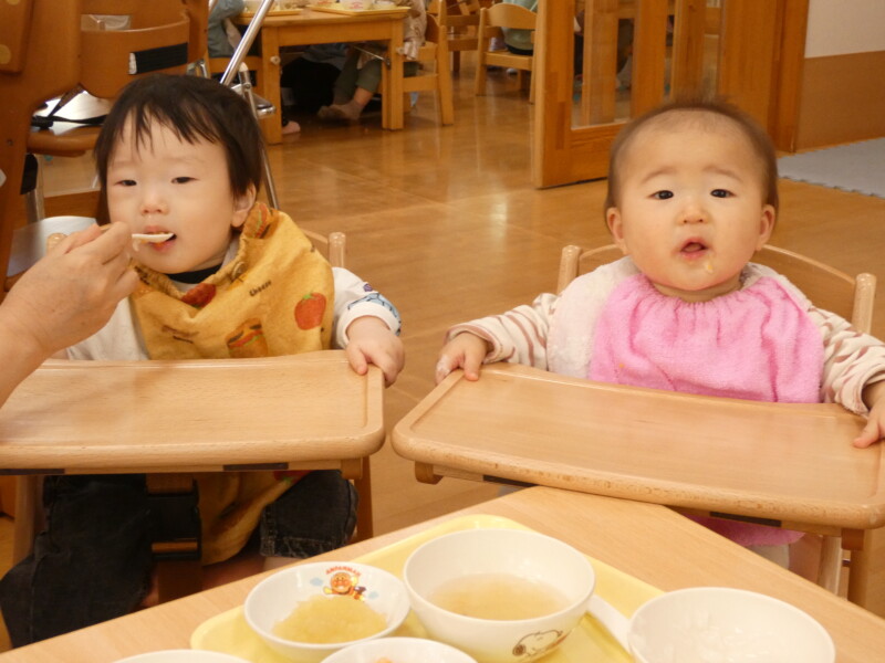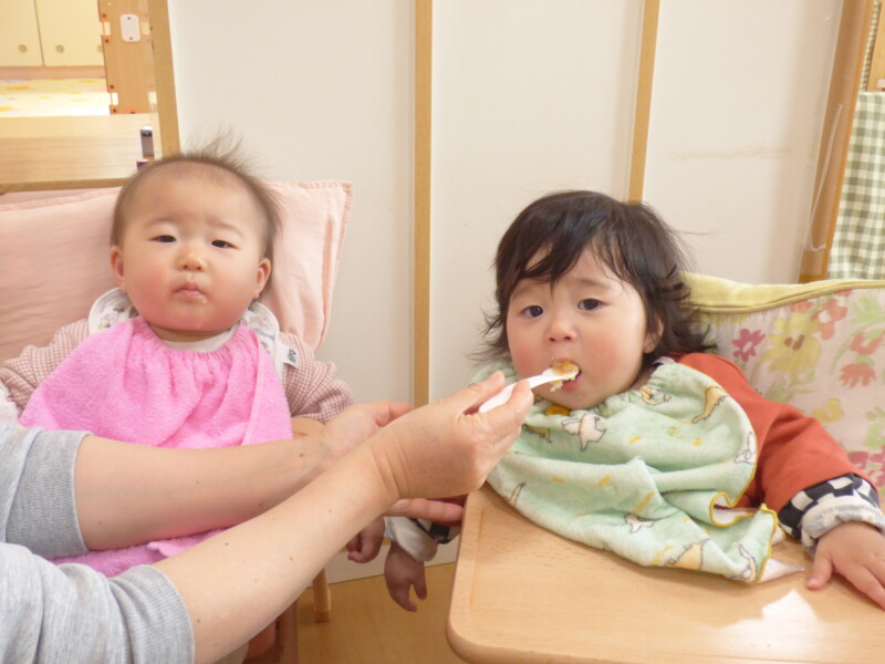 4月9日(木) 天気はいいけど風が強い。おまけに大量の花粉が飛んでいる。鼻水とくしゃみと目がかゆい。桜の咲くころには花粉症が治まると言われますが、桜が早く咲く場合でも適応するのでしょうか。園長室の下の花壇に「沈丁花」が咲き始めました。とても良い香りが漂っています。秋の金木犀のようなトイレに飾れば喜ばれそうな香りです。園庭の樹木にも新緑の葉が見え始めました。特にブナや紅葉の葉は天ぷらにするとおいしそうです。いよいよ春本番です。 昨日は乳児のきざみと離乳食後期の内容を載せましたが、本日は離乳の中期をご覧いただきたいと思います。基本的には当日の食材を使用して作ります。ご飯は「おかゆ」だったり軟飯だったり一人一人に合わせた調理をしています。スプーンを持てない子が多いので、職員が優しく口に運んでいます。さて、ランチルームの今日の給食は「ポークチャップ」と「法蓮草の白和え」でした。ポークチャップは豚肉と玉ねぎがケチャップの味付けで子どもたちの好きな一品になっています。意外なのが「法蓮草の白和え」。豆腐と胡麻にごまかされたのか、ほとんどの子が皿から口へ流し込んでいました。我が園の給食は、原則として「一品一皿」になっているので食器は手で持って食べます。ご飯も炊き立てが食べられるので子どもたちの食欲がそそられるようです。4月も三分の一が過ぎようとしています。来週には満開の桜が見られそうです。