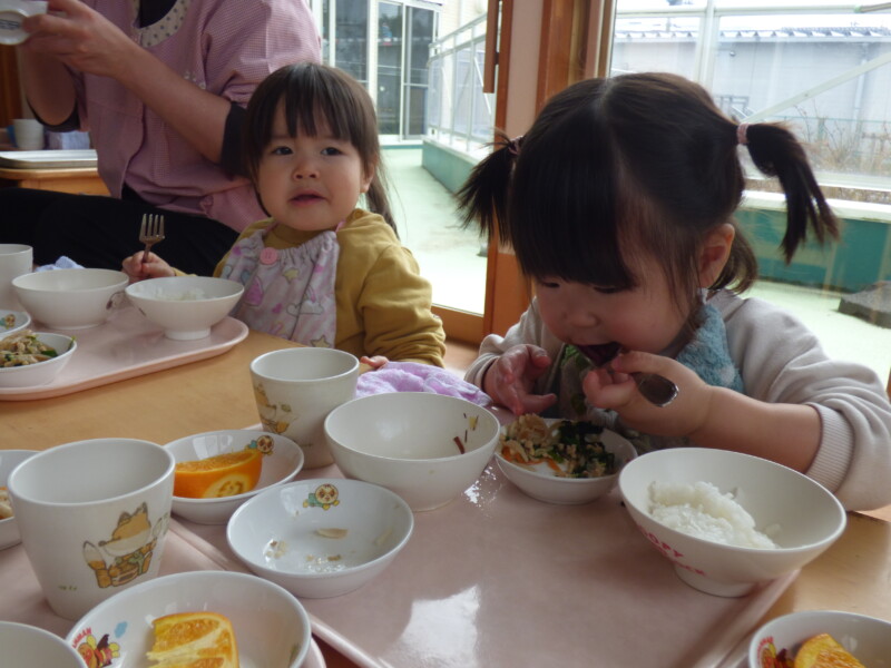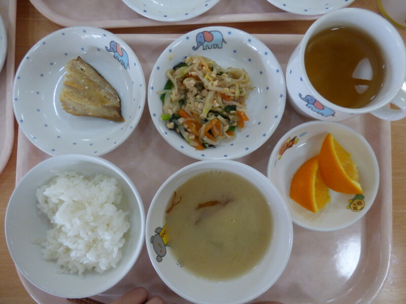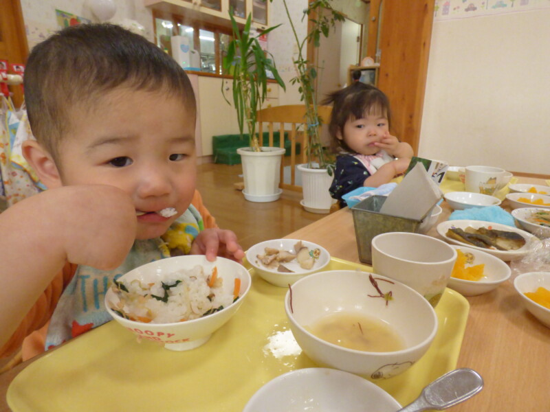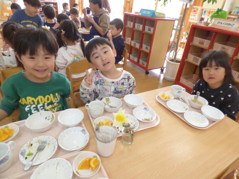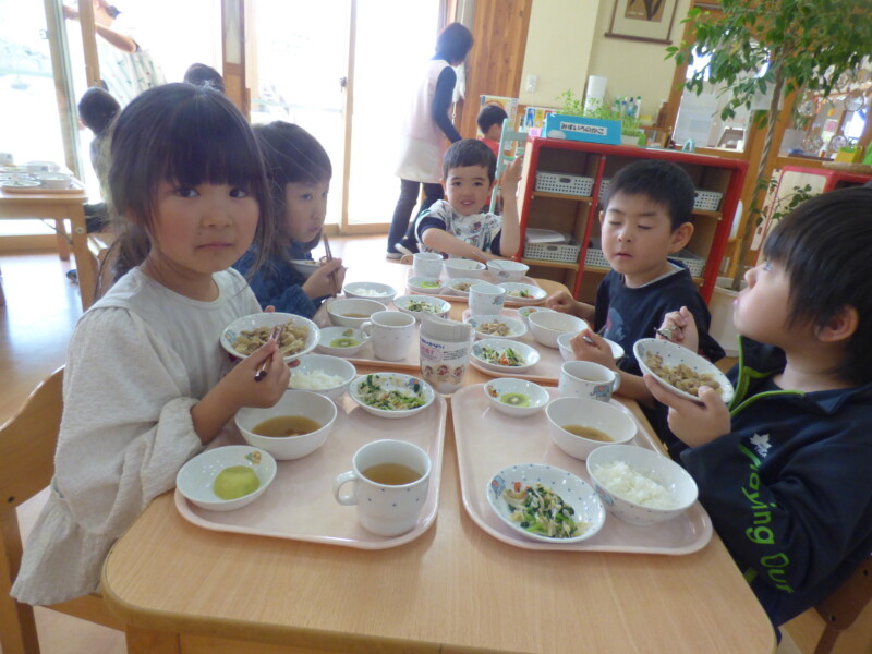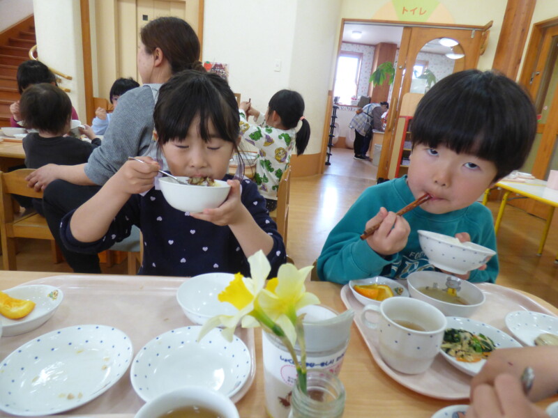 4月16日(木) 昨日はポカポカ陽気で外で給食を食べたのに、それが一転、昨日の暖かさはどこへやら…今日はとても冷える一日でした。そんな気温でも子ども達は元気いっぱい。「園庭で遊ぶ!」や、「今からお散歩して桜拾ってくるの!」とウキウキとした表情で教えてくれました。桜が咲くと、強風が吹いたり雨が降ったりして散ってしまう年も多いので、とりあえずはお花見にいくご家庭が多いであろう日曜日まで!もってほしいなと思います。 さて、今日の給食はほっけの塩焼き、野菜納豆和えでした。どちらもごはんに合うおいしいおかずでした。「お魚もっと食べたかったなあ」と、ほっけの塩焼きが人気でした。野菜納豆和えもみんなモリモリ食べていましたよ。 春はまだまだ日によっては寒暖差が大きいので、子ども達にはたくさん食べて元気に過ごしてほしいと思います。(松田)