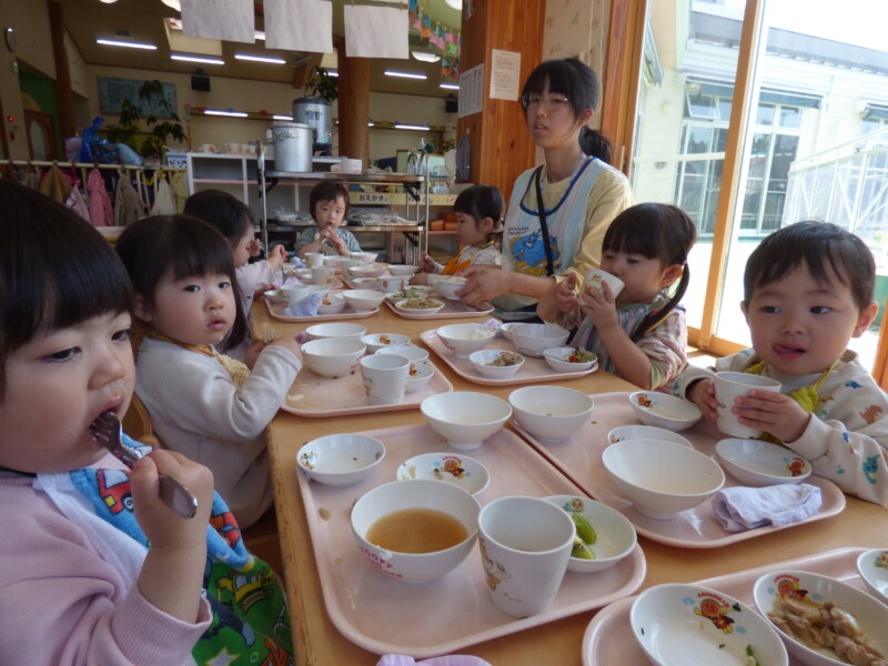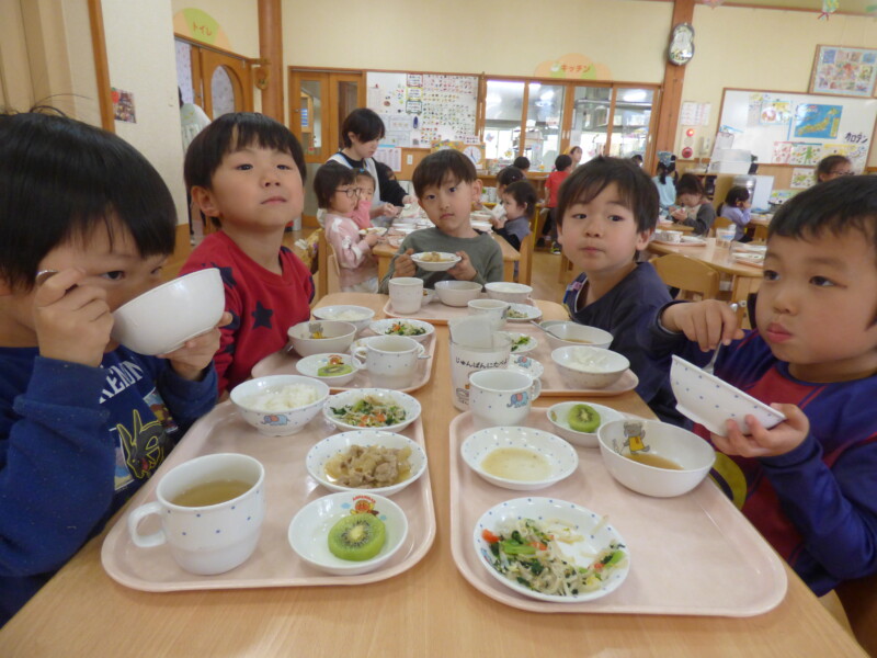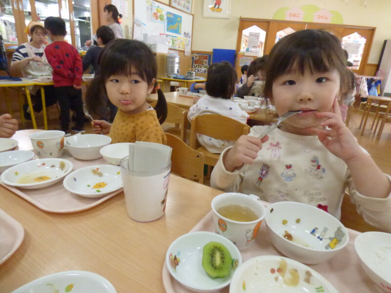 4月17日(金) 今日は暖かさが戻り、子どもたちは元気いっぱいに園庭をかけ回っていました。桜が満開の長坂公園へ行ったクラスは、「ママにプレゼントする」と風で落ちた花びらを集めていたそうです。2階にいるカブトムシの幼虫を久しぶりにのぞいてみると、大きくなっていてひまわり組の女の子たちが「さわりた~い」と両手で大事そうにもっていました。無事に成虫になれることを楽しみに待ちたいと思います。さて、今日の給食は、具沢山の食材が入っている『八宝菜』でした。「寿司のエビは苦手だけど、このエビはすき」とおかわりをして食べているお友だちもいて、調理法によって食べやすさが違うようです。初登場の『竹輪とひじきの炒り豆腐』には、焼き豆腐と竹輪、人参にひじき、彩にきぬさやが入り、栄養満点の一品でした。年長組のお友だちは、朝からたくさん遊びお腹が空いていたようで、「いただきます」と同時にモリモリ食べ始めているお友だちが多かったです!(若江)