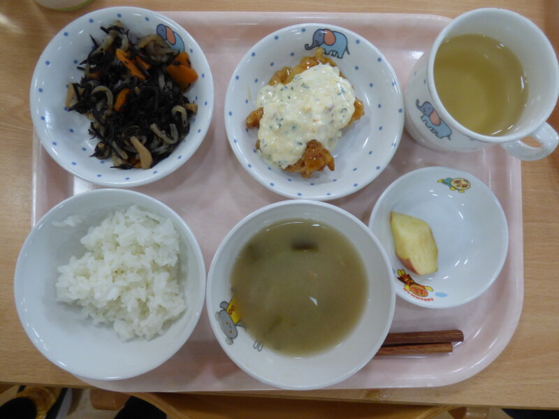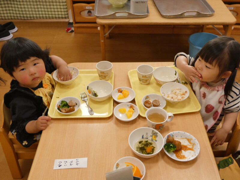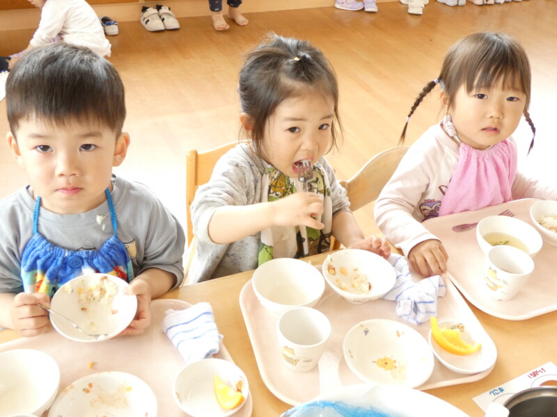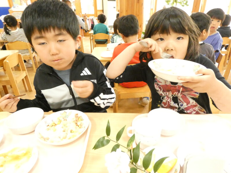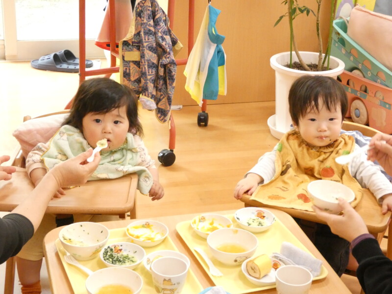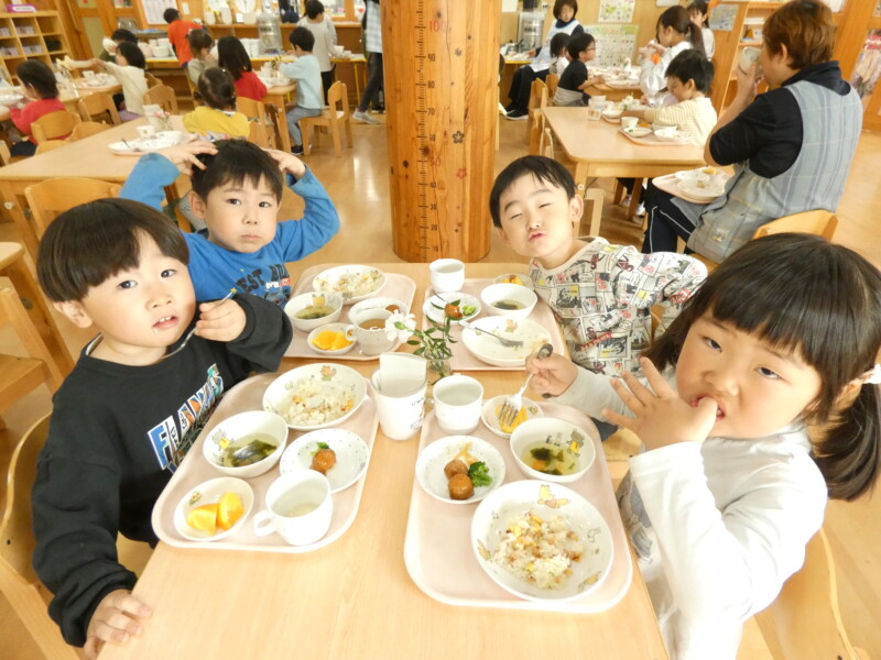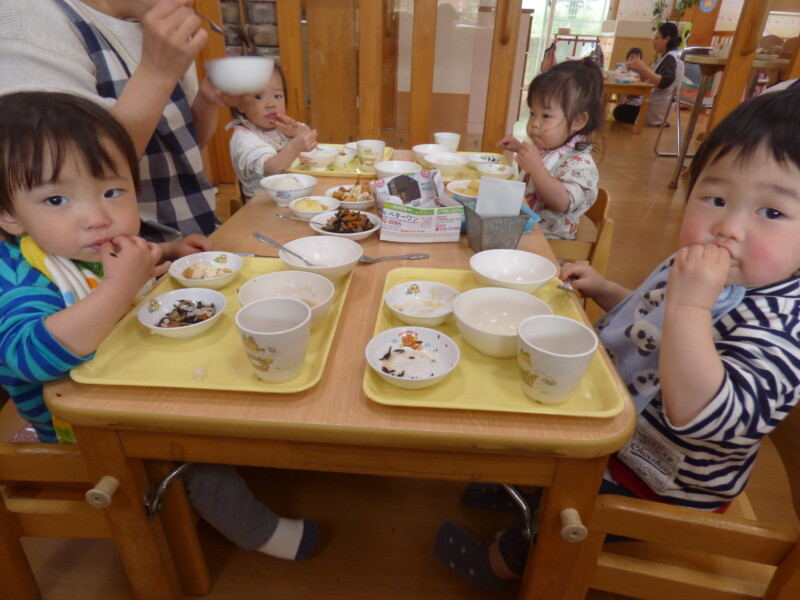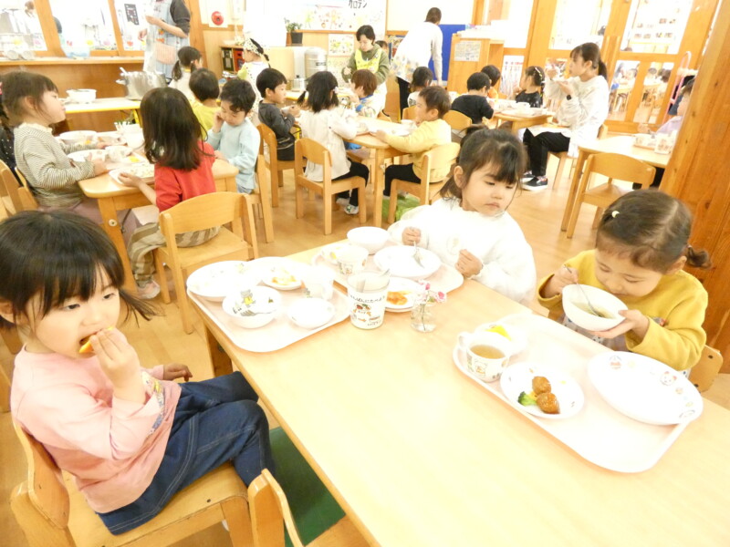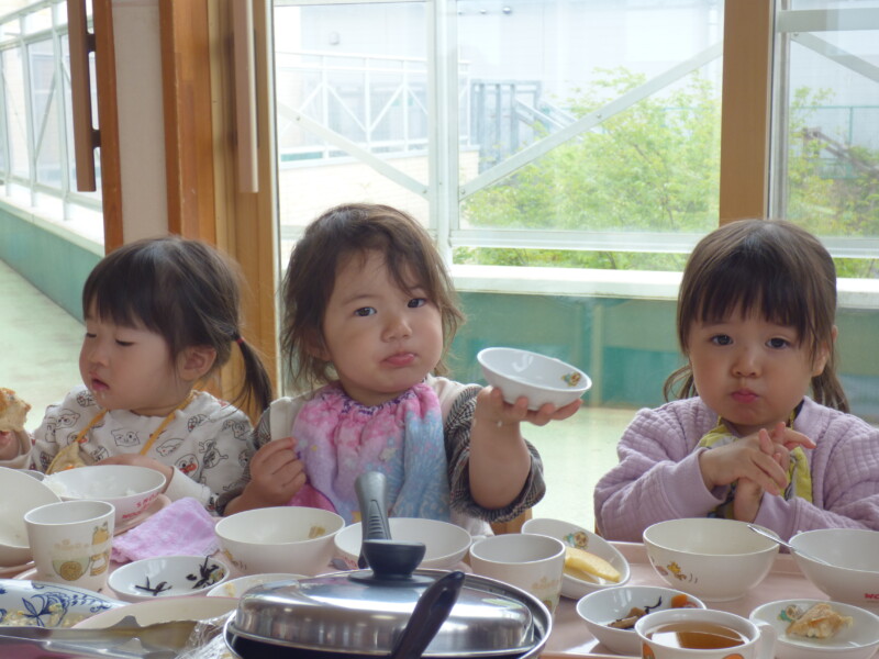 4月25日(土) 今日も気温は少し低めでしたが、朝から青空が広がるいい天気だったので、散歩や園庭で遊ぶお友だちが多くいました。「ただいま~」と室内に入ってきた姿を見ると、手も顔も服も、土で真っ黒になっていて、夢中になり遊んでいた様子が伝わってきました。戸外遊びが存分に楽しめる季節がやってきたので、草花を摘んだり虫探しをしたりするなど、たくさん楽しんでいきたいと思います。 さて、今日の給食は『ほうとううどん』でした。”ほうとう”は山梨県の郷土料理だそうですが、保育園では時々登場していて、子どもたちにも人気があります。おかわりが始まると、大行列ができていました。ツルリッと麺を上手にすすりながら食べている姿がかわいらしかったです。『小松菜とえのきのお浸し』は、苦手なお友だちは「少しです」と盛り付けてもらっていましたが、大盛で食べているお友だちも多くいました。あっという間に4月最後の土曜日になり、大型連休の気配を感じ始めています。明日は気温も高くなる予報なので、暑さ対策も行いながら楽しんでくださいね。(若江)