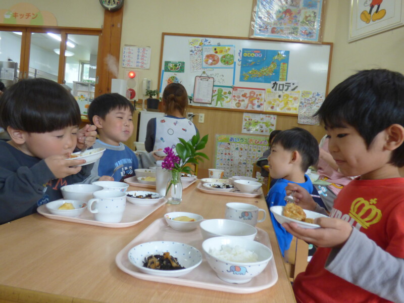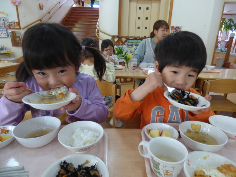 4月23日(木) 今日の午前中、焼き鯖の良い香りが園内に漂っていました。おなかがすくおいしいにおいでした。子ども達に「お魚のいいにおいがするね」というと、一人の子が「先生、お魚じゃないよ。サバだよ。」と教えてくれました。給食室前のホワイトボードや家庭で、給食のメニューをしっかり確認する習慣がついているんだなあと感心し、嬉しく思いました。 さて、今日の給食は焼き鯖のおろし煮、引き昆布の煮物でした。長坂の子ども達は和食好きが多く、どちらもおいしそうに食べていました。鯖はごはんに合う一品で、小さいクラスの子ども達もおいしそうに食べていましたよ。お皿がピカピカになると、先生たちに嬉しそうにみせていました。全部食べられた!と、子ども達も誇らしいようです。 今日は気温は低いものの風がなく、日差しがポカポカ良い日でした。子ども達も、根城の広場にお散歩に行ったり、半袖短パンで遊んだり、外遊びを楽しんでいましたよ。(松田)