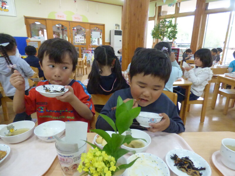 4月22日(水) 今日も強風が吹き荒れています。今年初めてのウ”ァンラーレ八戸のサッカー教室がありました。強風の中を一生懸命ゴールを目指してキックしていました。見ているとなかなか筋のいい子もいて、これからの練習が楽しみです。それにしても毎日風速30メートル以上の強風には閉口します。それでも子どもたちはウ”ァンラーレ八戸のプロ選手たちの指導を受け大喜びのようでした。 さて、本日は、子どもたちが楽しみにしている「おにぎりの日」でした。各家庭から自慢のおにぎりを見せ合いながらわいわい騒ぎながら食べていました。メニューは「かき揚げ」と「法蓮草の胡麻和え」でした。かき揚げには、玉ねぎ、人参、春菊、エビも入っていました。胡麻和えは法蓮草よりもやしが主のようでした。汁物は八戸名物「せんべい汁」です。こちらは本日鶏肉のせんべい汁でした。なにしろ、汁物にせんべいを入れるとなんでも「せんべい汁」になるので、一応中身で判断します。保育園ではなかなか出ませんが「鯖缶」のせんべい汁も売れ行きが良いようです。風がなければもっと楽しい「おにぎりの日」だったと思いますが、楽しみは次回に取っておきましょう。