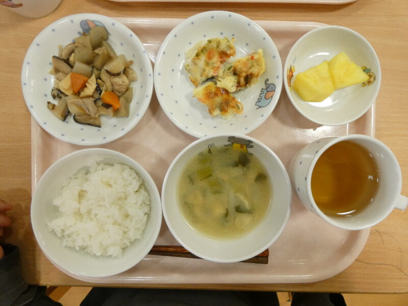 鱈のチーズ焼き 筑前煮 ごはん 味噌汁(玉葱、油揚げ、小松菜) パイン お茶