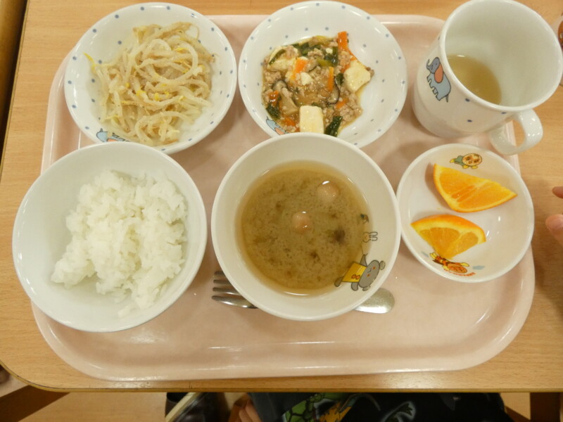 麻婆豆腐 もやしナムル ごはん 味噌汁(なす・板麩) オレンジ お茶