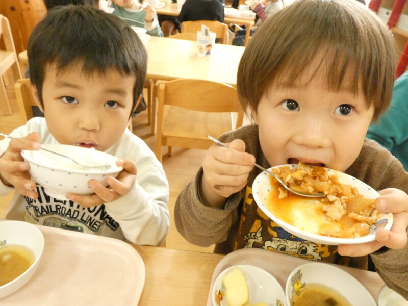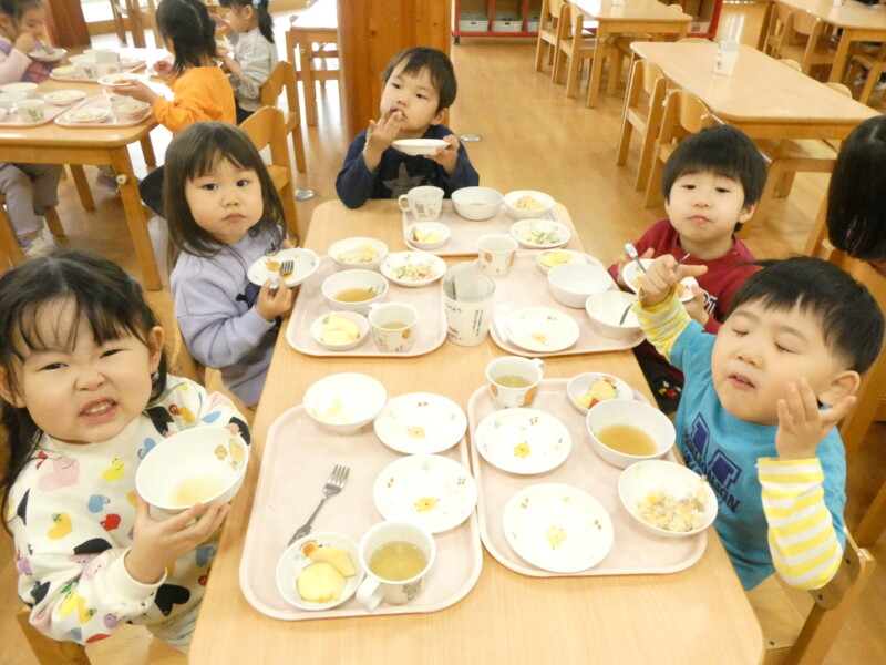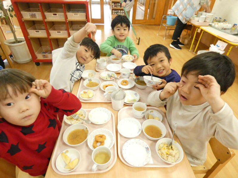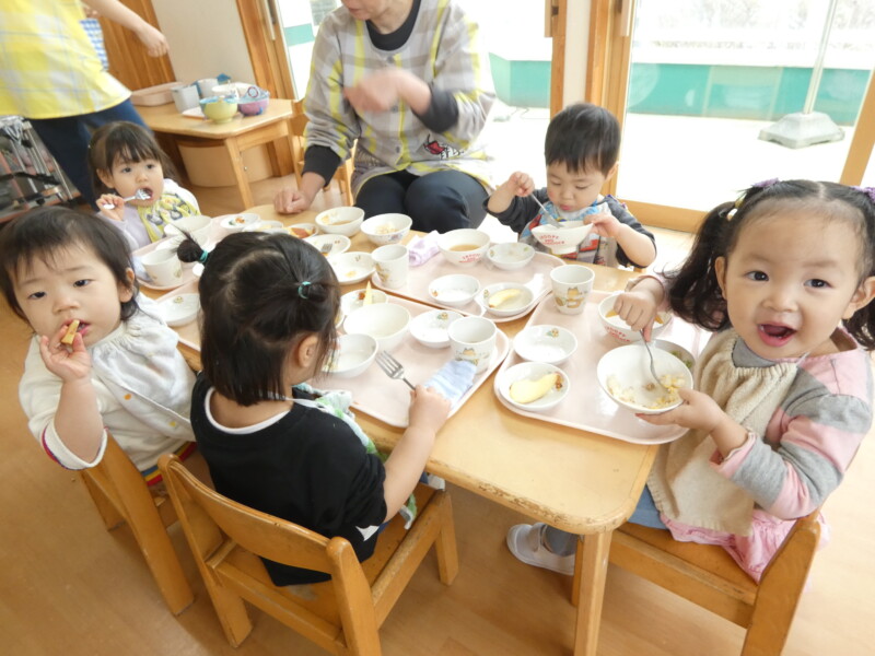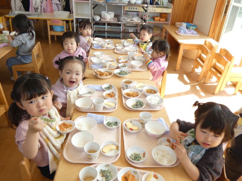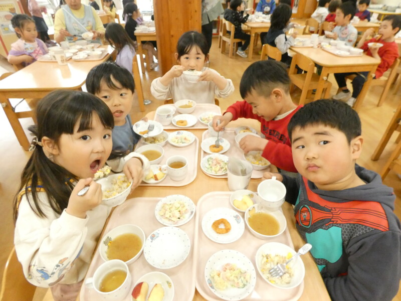 4月4日(土) 今日の天気予報では最高気温が17℃。暖かいんだろうなあと思っていましたが、実際は風が強く、少し肌寒く感じる1日でした。園庭では子ども達が砂場で「納豆ご飯作ってるの!」と、顔を黒くしてクッキングをしていました。「あったかくなったら泥遊びできるんだよね?」や「水遊びがしたいなあ」の声が聞こえてきました。夏の遊びを今から楽しみにしている子ども達です。 さて、今日の給食はそばめしでした。私事ですが、家でそばめしを作らないので、実は楽しみにしているメニューの一つです。ソース味のチャーハンといった感じで、豚肉やキャベツが入り、桜エビがアクセント。もちろん苦手な子もいますが、外でたくさん遊んだ子ども達は食欲旺盛!モリモリ食べていましたよ。今日は温かい肉団子のスープがものすごくおいしく感じました。もやしや青梗菜など野菜もたっぷりのスープで、おかわりをする子も多かったです。 明日は日曜日。新年度に入って環境が変わったりしたので疲れている子も多いかもしれません。ゆっくり休んで、月曜日また元気に会いましょうね。(松田)