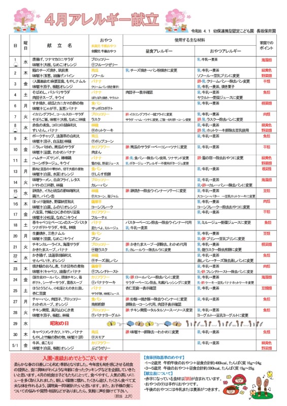 アレルギー児対応献立表