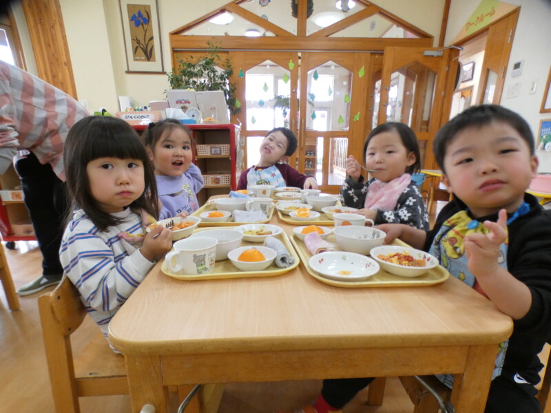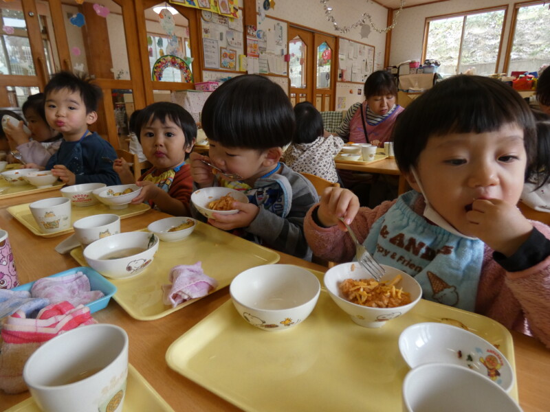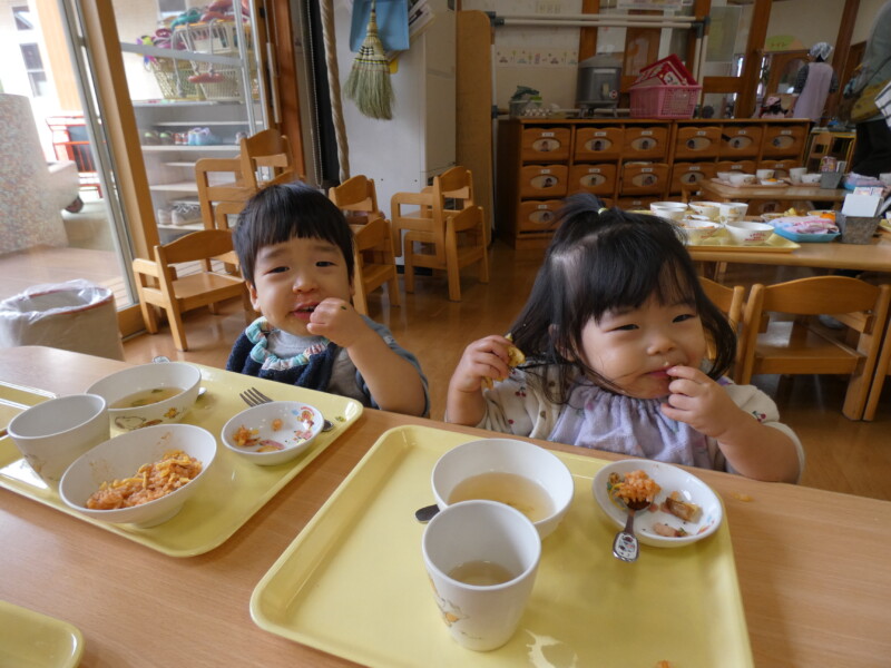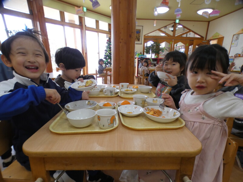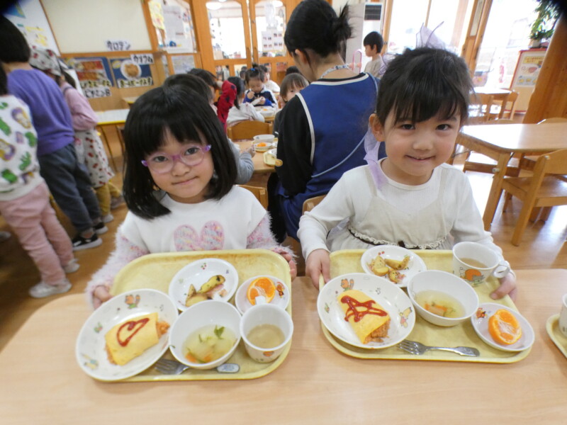 12月13日(土)今日は、ほとんどのクラスが室内で運動あそびをしたり、好きなコーナーで遊んだりしました。 つくし組のお友だちが2階のたんぽぽ組の部屋で遊んだのですが、いつもと違う環境や玩具に興味津々で、集中して遊んでいました。早いもので、年明けには各クラス来年度に向けて少しずつ「移行」の準備が始まります。無理なく子どもたちに合わせて進めていきたいと思います。 年長組の園児がニュースを見たようで、「学校の給食が食べれないんだって。保育園では食べれるよね」と言っていました。毎日お弁当の小学校もあるようです…。長坂は無事で、被害も少なくてよかったなと改めて思いました。今日の給食はみんな大好きなオムライス!バイキングでは「おおきいのください」と言う子が多く、「ハートかいて! 星かいて!」とケチャップのリクエストも多かったです。ジャーマンポテトはおかわりする子が多かったですよ! (佐々木綾乃)